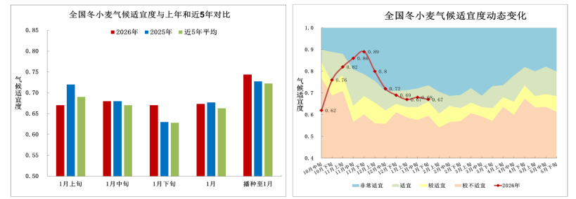 播种以来,全国冬小麦平均气候适宜度为0.74,分别比上年和近5年平均高0.1、0.2。1月,全国冬小麦平均气候适宜度为0.67,比上年低0.01,比近5年平均高0.01,其中上、中、下旬气候适宜度分别为0.67、0.68、0.67,比上年分别低0.05、持平、高0.04(图5)。