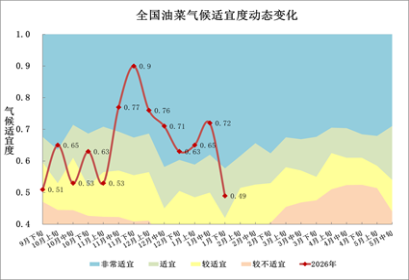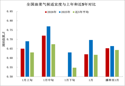 播种以来,全国油菜平均气候适宜度为0.65,比上年同期偏低0.01,比近5年平均高0.01。1月,全国油菜平均气候适宜度为0.62,比上年同期低0.08,与近五年平均持平,其中上、中、下旬气候适宜度分别为0.65、0.72、0.49,分别比上年低0.04、0.05、0.14(图6)。