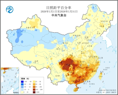 图3 全国日照时数及日照距平百分率图(2026年1月1日至1月31日)