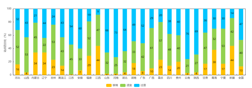 附图2 10月19日分省20厘米土壤墒情统计(站点百分比)
