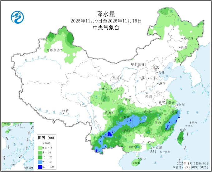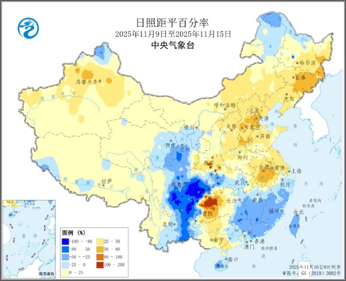 本周(2025年11月2日-11月8日),全国大部农区气温较常年偏高1~2℃,其中内蒙古、华北大部、西北地区中东部、青藏高原东部等地偏高2~4℃;仅广西中南部、新疆西部等地偏低1~4℃(图1)。本周较强降水主要集中在南方农区,江淮南部、江汉东部、江南大部、华南北部、海南、云贵等地降水量普遍有25~100毫米,局地100~250毫米(图2),上述地区较常年同期偏多1~4倍;其余农区大部降水量不足25毫米或无有效降水。全国日照较常年同期偏少,其中西北地区东部、江汉大部、江淮南部、江南、华南大部、西南地区东部和南部等地偏少3~9成(图3)。