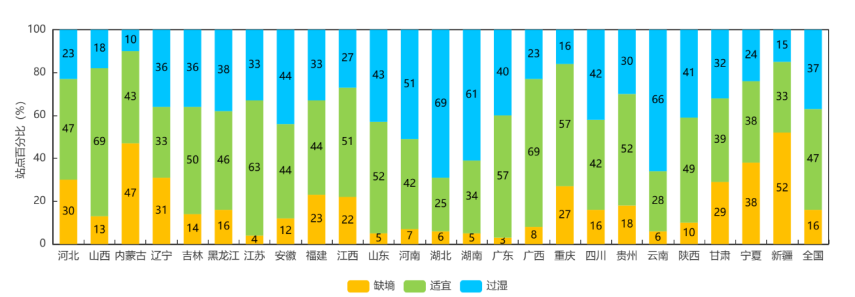 附图2 11月9日分省20厘米土壤墒情统计(站点百分比)
