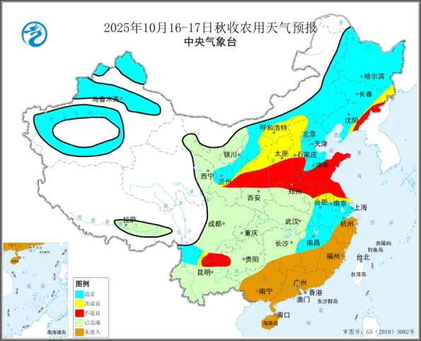 16-17日,吉林东部、辽宁东部、内蒙古中部偏南、甘肃东部、宁夏南部、陕西、山西、河北西部、河南中北部、山东中南部、江苏北部、安徽北部以及云南北部等地有小到中雨、部分地区大到暴雨,部分地区前期土壤持续过湿,农机无法下地,秋收受阻,秋收气象等级为次适宜到不适宜;其余秋收区大部以晴好天气为主,秋收气象等级为适宜(图2)。