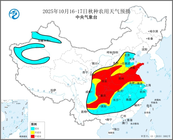 10月15日,黄淮南部、江淮北部、江南西北部、江汉中北部、西南地区东部等地有小到中雨,局地大雨,农田土壤过湿,不利于腾茬整地,秋种气象等级为次适宜到不适宜;其余秋种区大部以晴好天气为主,秋种气象等级为适宜(图3)。
