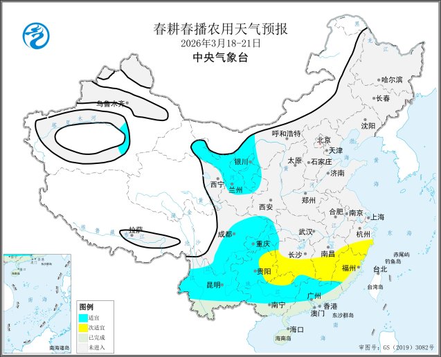 预计18-21日,江南南部以及福建大部、广西北部、贵州东部等地有1~2天小到中雨、局地大雨,春耕春播气象条件等级为次适宜(图1);西北春播区、西南春播区多晴好天气,土壤墒情良好,春耕春播气象条件等级为适宜。