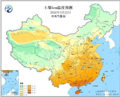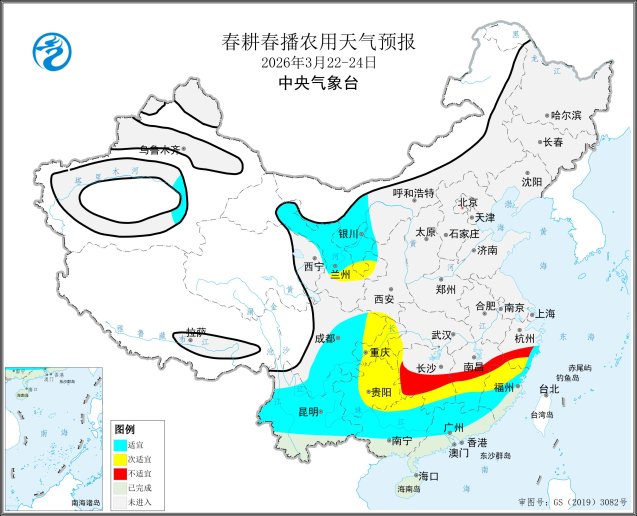 预计22-24日,西南地区东部、江南中南部有中到大雨、局地暴雨,春耕春播气象条件等级为次适宜至不适宜;22日,西北春播区南部有小雨或雨夹雪,春耕春播气象条件等级为次适宜;全国其余春播区以晴到多云天气为主,春耕春播气象条件等级为适宜(图2)。