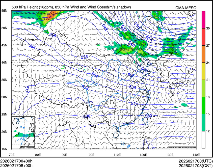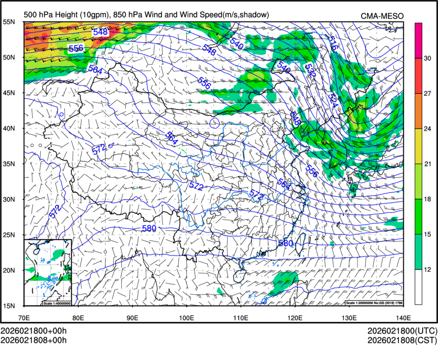 500hPa高度+850风场+850大风速(大于等于12)