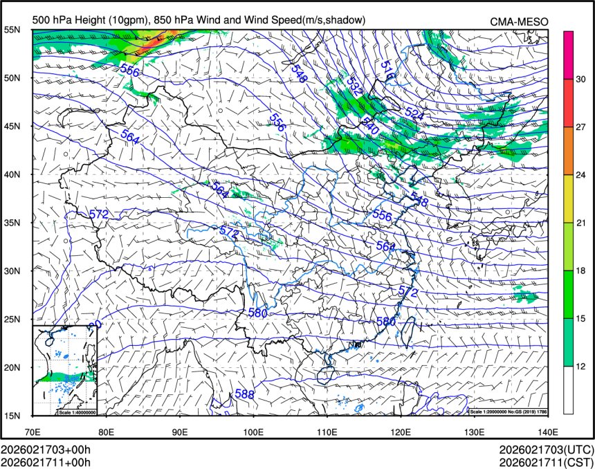 500hPa高度+850风场+850大风速(大于等于12)