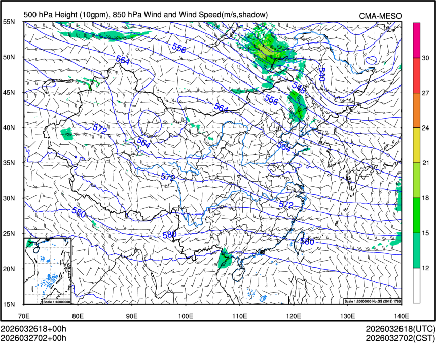 500hPa高度+850风场+850大风速(大于等于12)