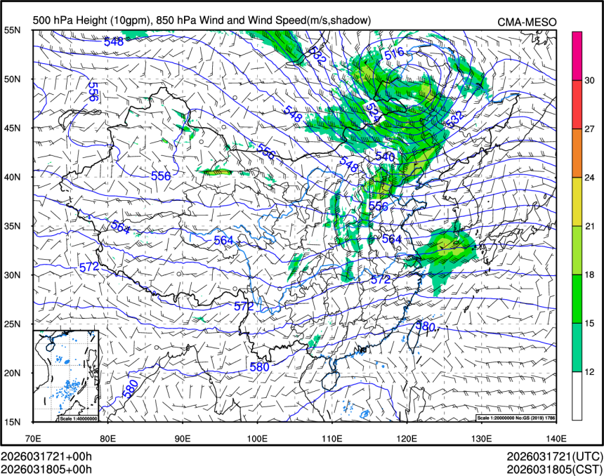 500hPa高度+850风场+850大风速(大于等于12)