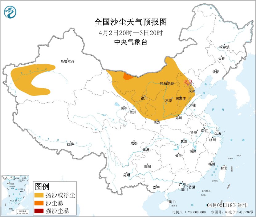 受冷空气大风影响,预计4月2日20时至3日20时,新疆南疆盆地、内蒙古中西部、甘肃中东部、宁夏、陕西中北部、山西、北京中西部、天津中西部、河北中南部、河南北部等地的部分地区有扬沙或浮尘天气,其中,内蒙古西北部等地局部有沙尘暴。
