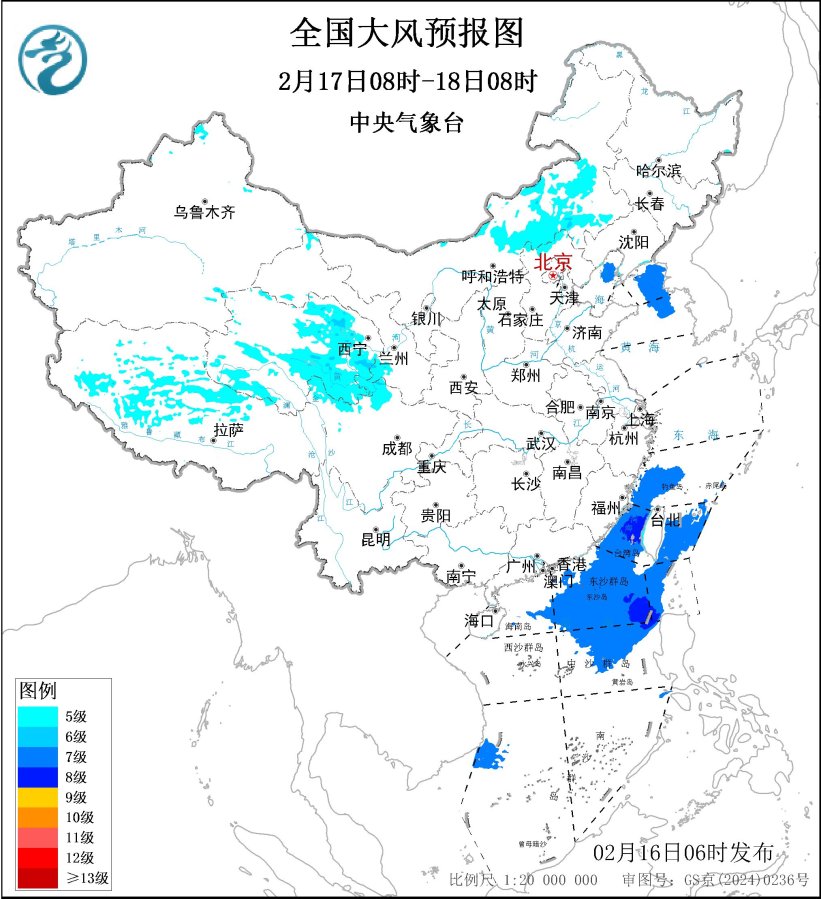 2月17日08时至18日08时,内蒙古中部、西藏中西部、青海东部和南部、甘肃南部、河北北部、川西高原北部等地部分地区有5~6级、阵风7级的大风,其中,青海东部、川西高原北部阵风可达8~9级;渤海北部海域、黄海北部和中部海域、东海西南部海域、台湾海峡、台湾以东洋面、南海东北部和中东部海域、巴士海峡将有7~8级、阵风9级的大风。