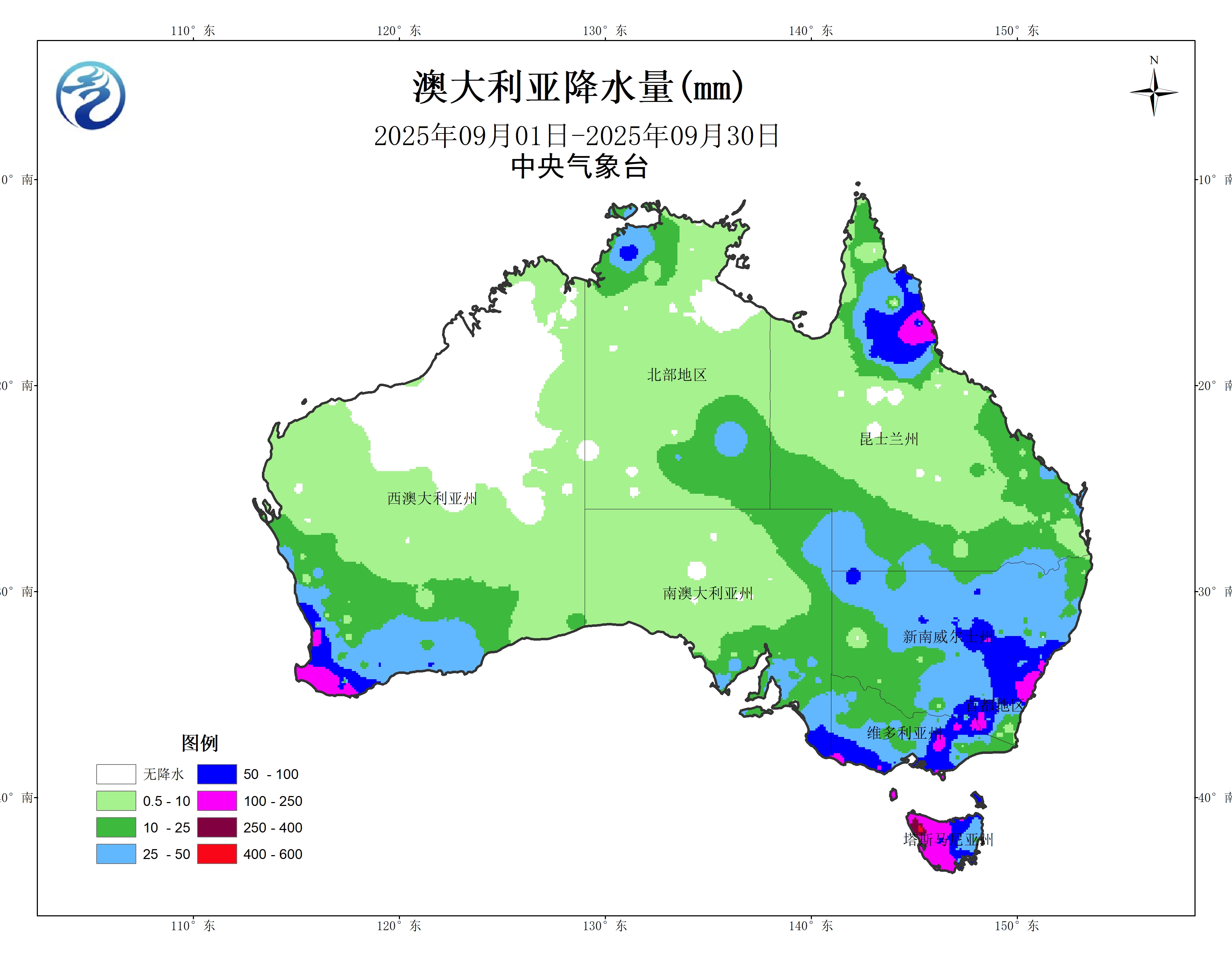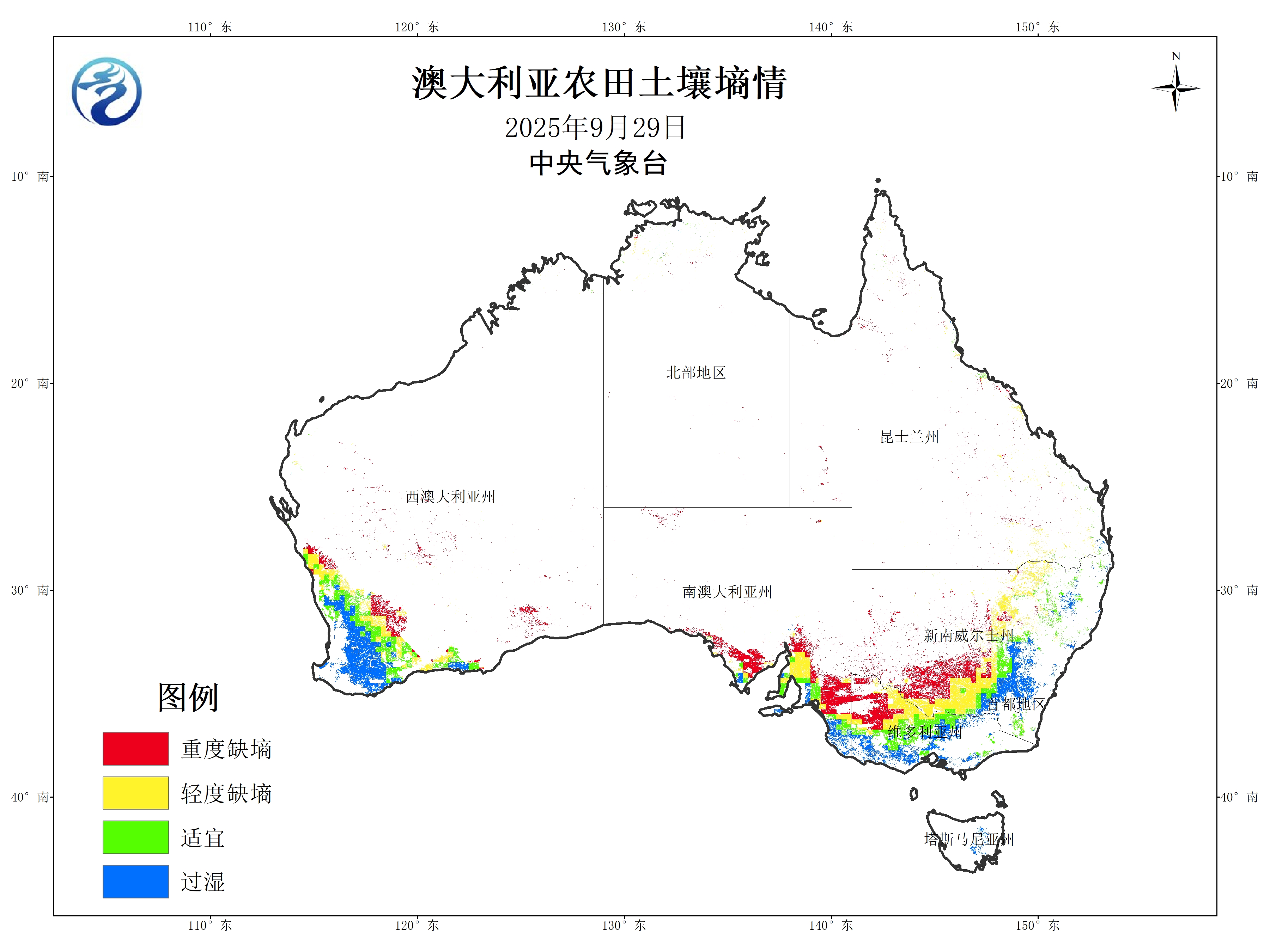 9月,澳大利亚农区大部气温与常年同期持平(图8),西澳大利亚西南部、新南威尔士州、维多利亚州、昆士兰州南部等地出现10~100毫米降水(图9),大部小麦产区土壤墒情较好(图10),有利于冬小麦抽穗开花和灌浆。