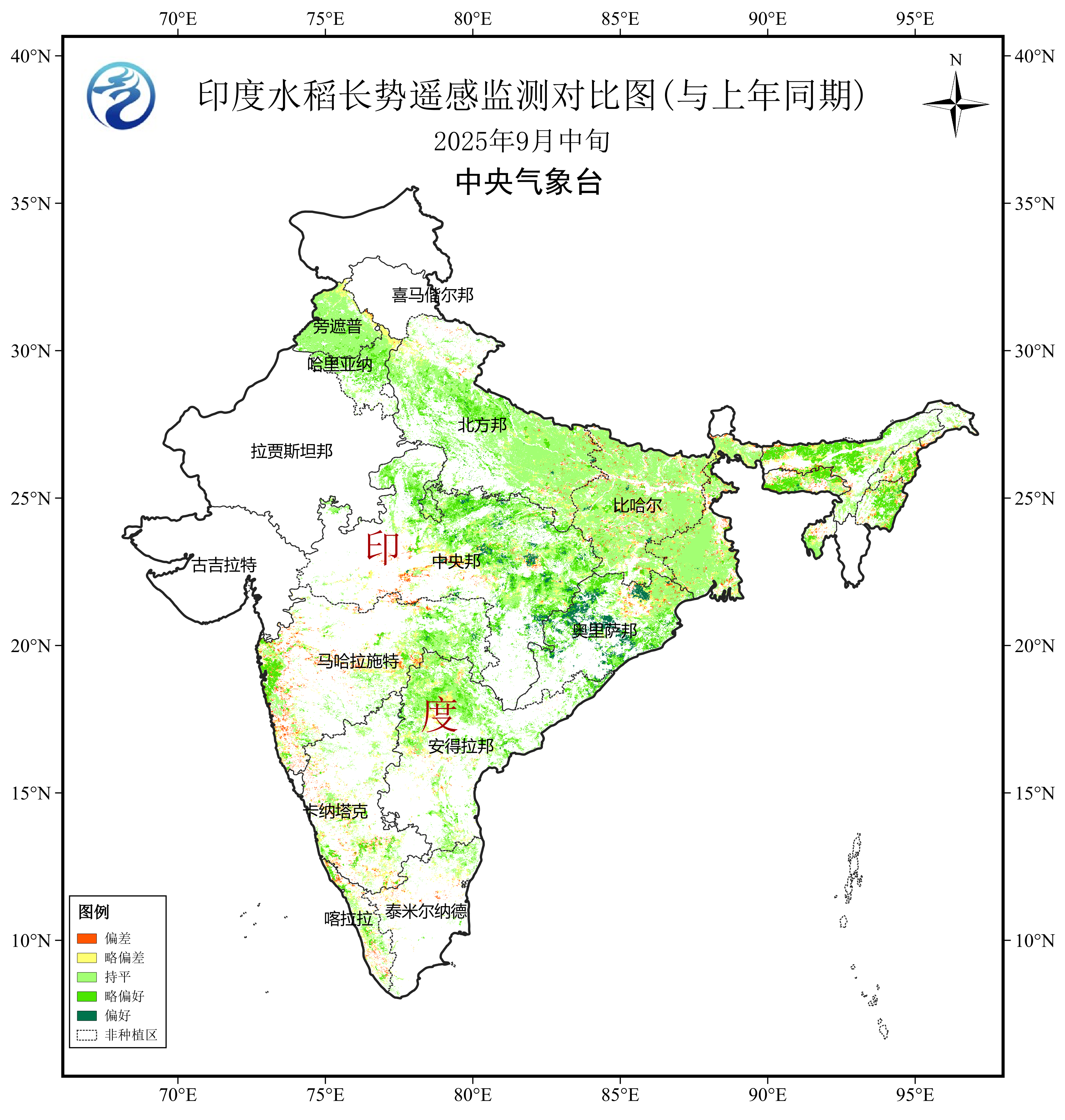 9月中旬卫星遥感监测结果显示:印度水稻长势与上年同期相比,持平比例为71%,偏好比例为15%,偏差比例为14%(图11),长势与上年同期持平。