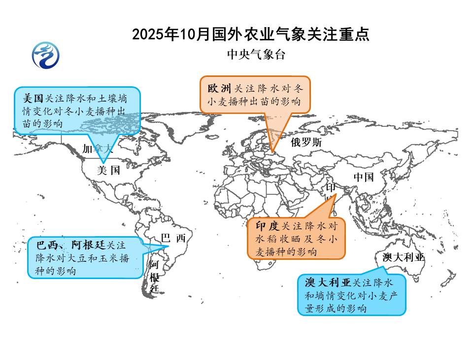 10月,美国、欧洲等地冬小麦和巴西大豆、玉米将进入大范围播种出苗阶段,需关注气温、降水和土壤墒情变化对作物播种出苗和幼苗生长的影响。印度水稻将处于成熟收获期、小麦进入播种期,需关注降水对水稻收获晾晒和小麦播种出苗的影响。澳大利亚冬小麦将进入灌浆成熟阶段,需关注气温和降水对小麦产量形成的影响(图13)。