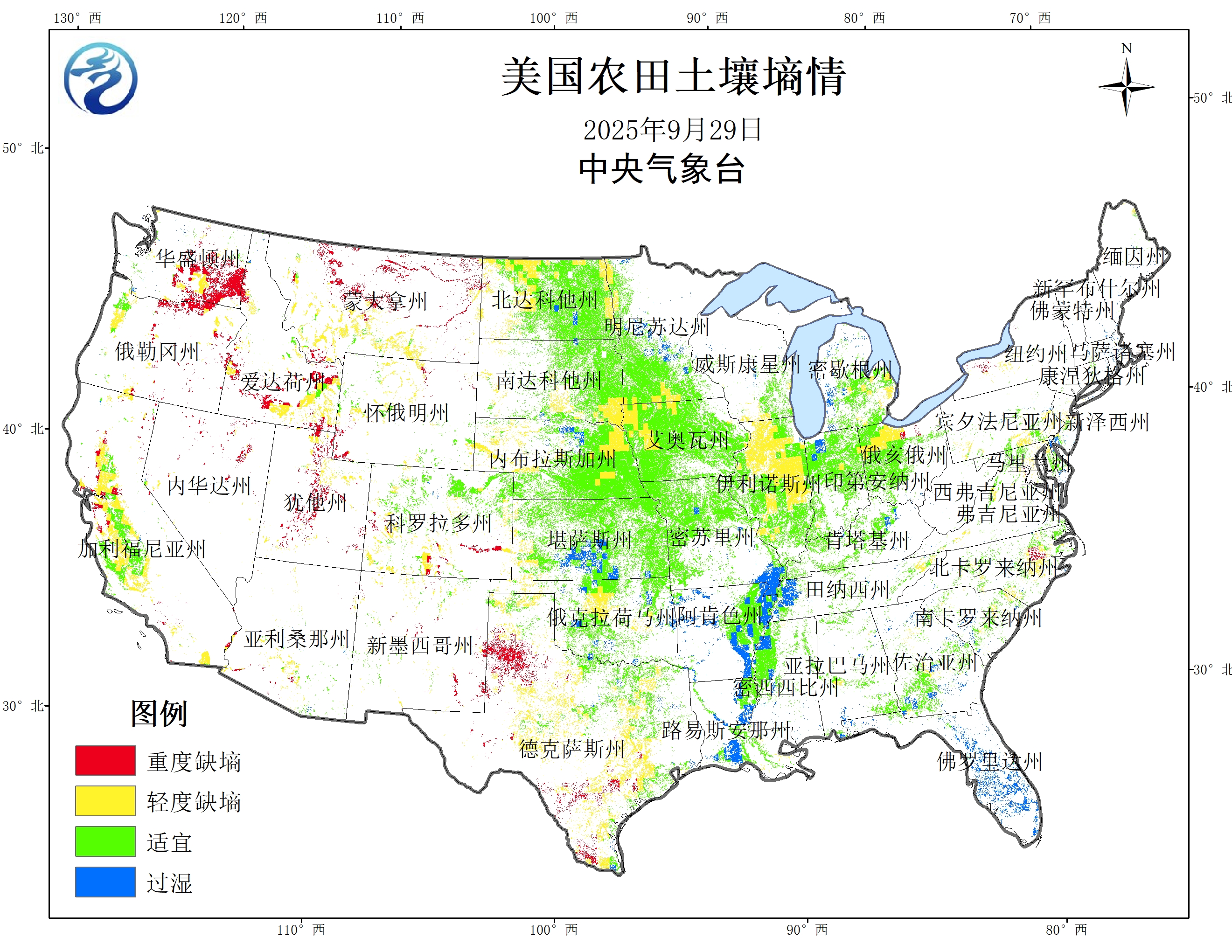 9月,美国大部平均气温较常年同期偏高1~4℃,东部和南部部分地区平均气温接近常年同期(图1);明显降水主要出现在中东部地区,降水量普遍为10~50毫米,部分地区为50~100毫米、局地达100毫米以上(图 2)。月内,美国中北部玉米和大豆主产区气温略偏高、降水偏少,利于作物灌浆乳熟和成熟收获,收获进程接近常年。美国北部冬小麦开始播种,产区大部土壤墒情较好,利于冬小麦适时播种出苗,仅华盛顿州、蒙大拿州、爱达荷州、德克萨斯州等地墒情偏差(图3),不利于小麦播种出苗和幼苗生长。