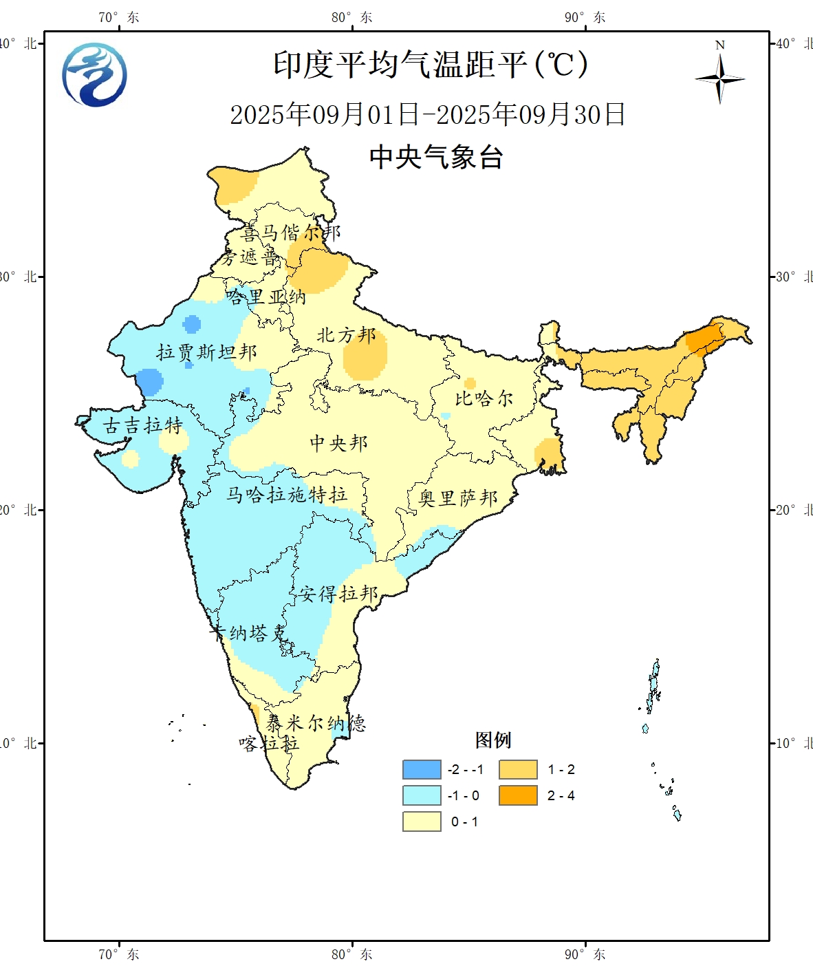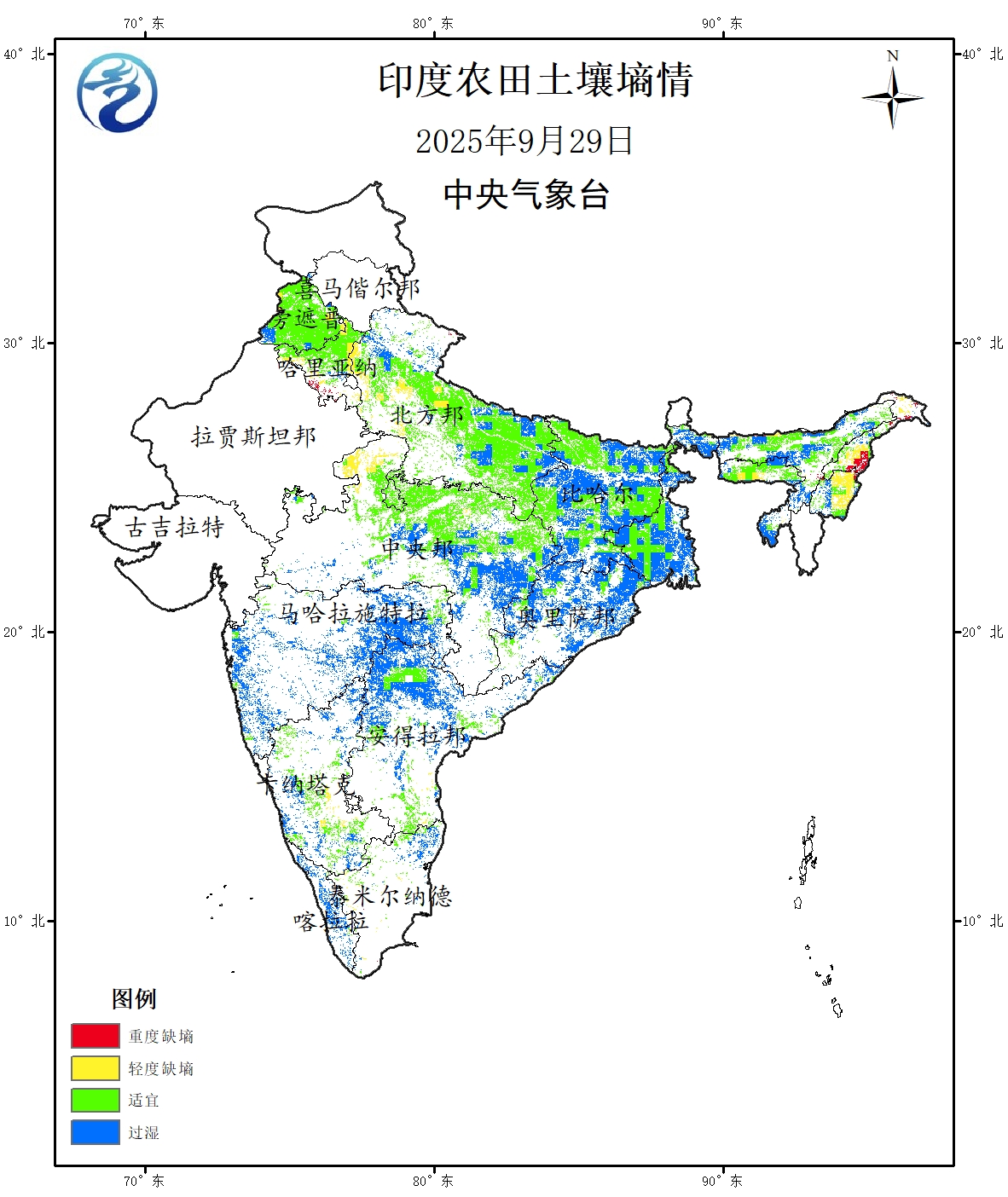 9月,印度大部平均气温与常年同期持平,其中东北部偏高1~2℃(图4);降水量普遍有100~250毫米,有效补充了农田水分,充沛的降水利于水稻产量形成,也为冬小麦播种提供了良好的底墒条件。但比哈尔邦、奥里萨邦等地部分农田出现积水或土壤过湿(图5),导致部分作物遭受渍涝害。