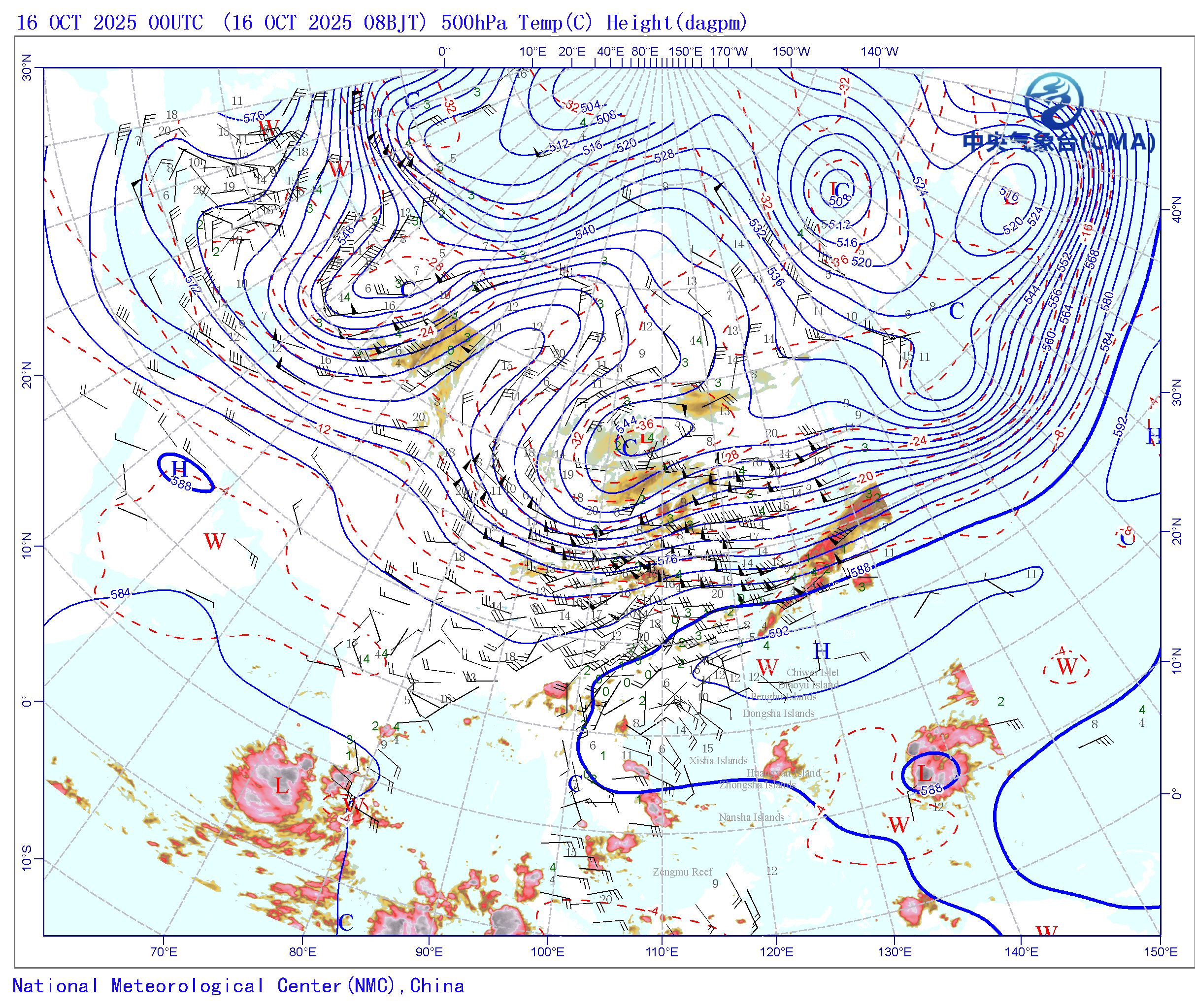 站点的填图要素包括:风向风速和温度露点差;天气系统符号包括:高压中心(H)、低压中心(L)、暖中心(W)、冷中心(C)和台风符号;蓝色等值线为等高线(单位dagpm);红色等值线为等温线(单位℃),其中零摄氏度以下以虚线显示;底层填色为地形高度;顶层填色为红外卫星云图。