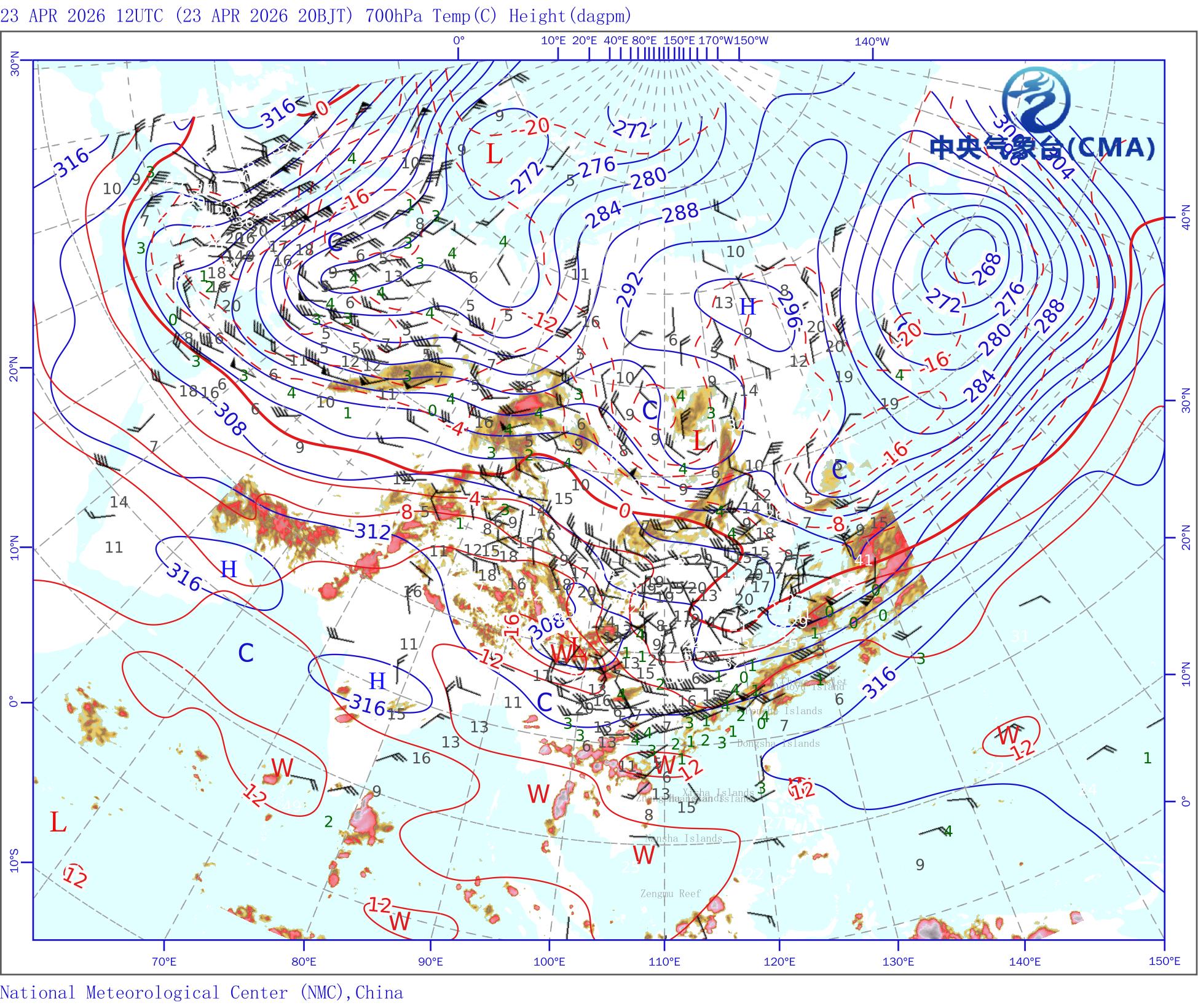 站点的填图要素包括:风向风速和温度露点差;天气系统符号包括:高压中心(H)、低压中心(L)、暖中心(W)、冷中心(C)和台风符号;蓝色等值线为等高线(单位dagpm);红色等值线为等温线(单位℃),其中零摄氏度以下以虚线显示;底层填色为地形高度;顶层填色为红外卫星云图。