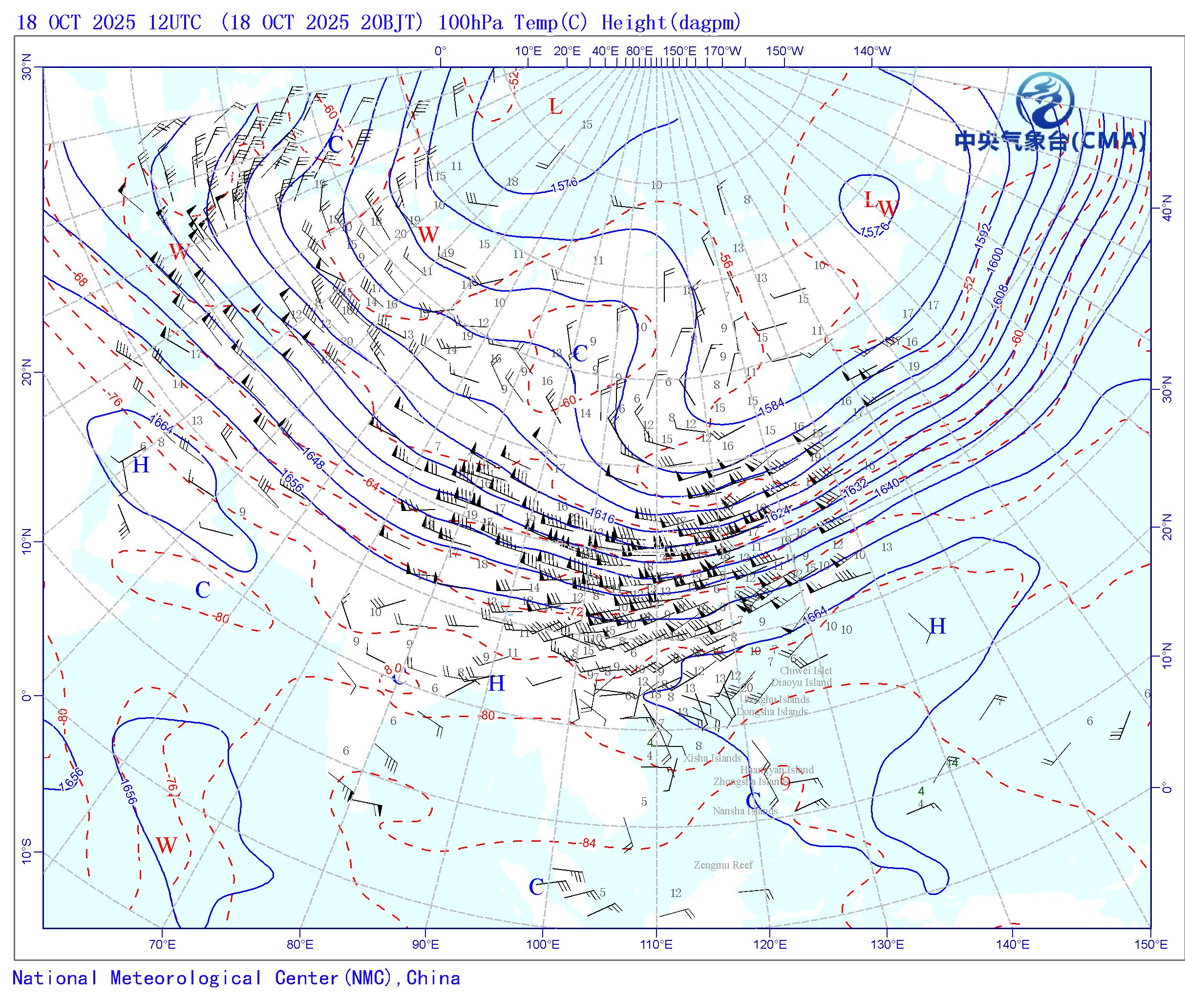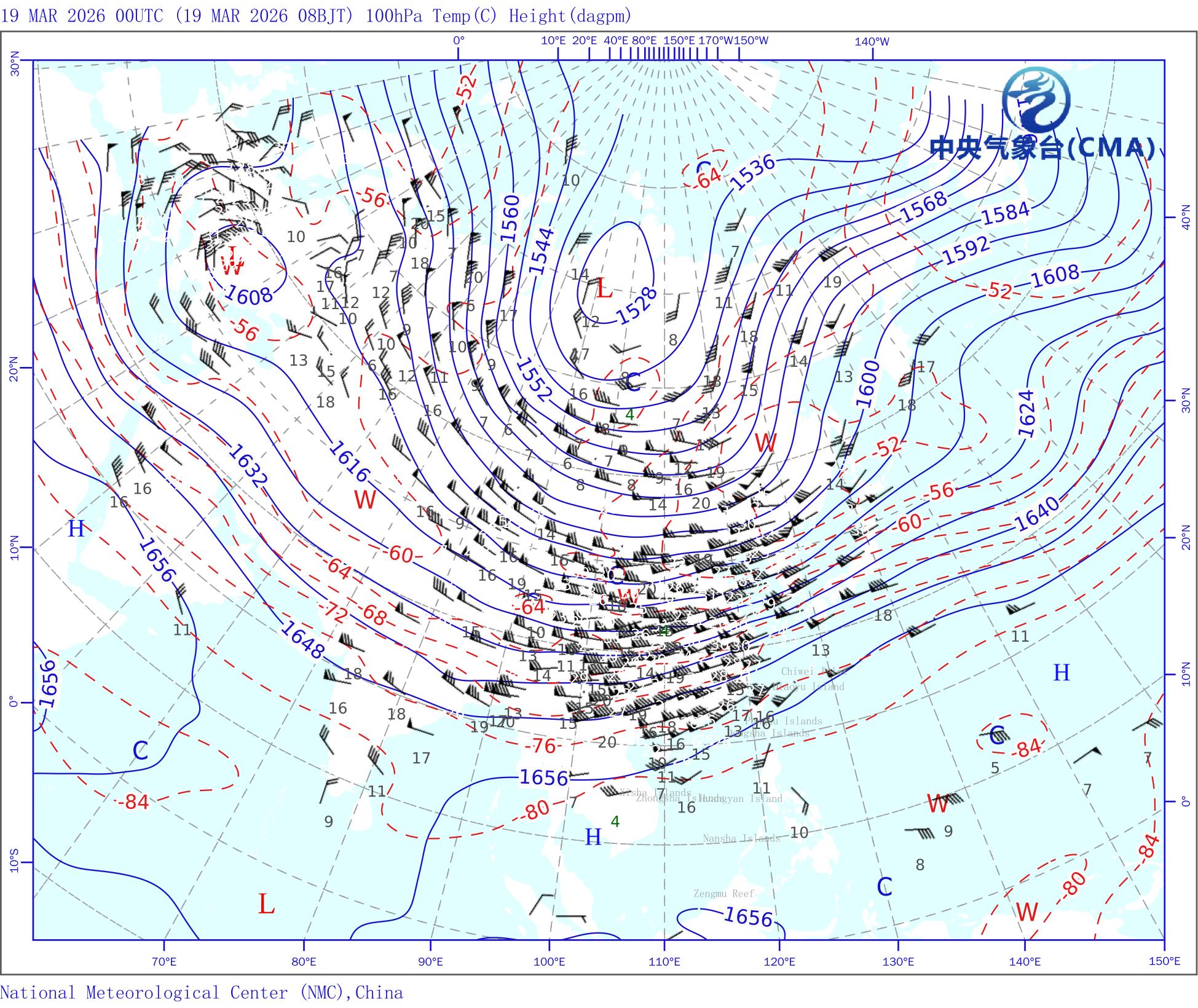 站点的填图要素包括:风向风速和温度露点差;天气系统符号包括:高压中心(H)、低压中心(L)、暖中心(W)、冷中心(C)和台风符号;蓝色等值线为等高线(单位dagpm);红色等值线为等温线(单位℃),其中零摄氏度以下以虚线显示。