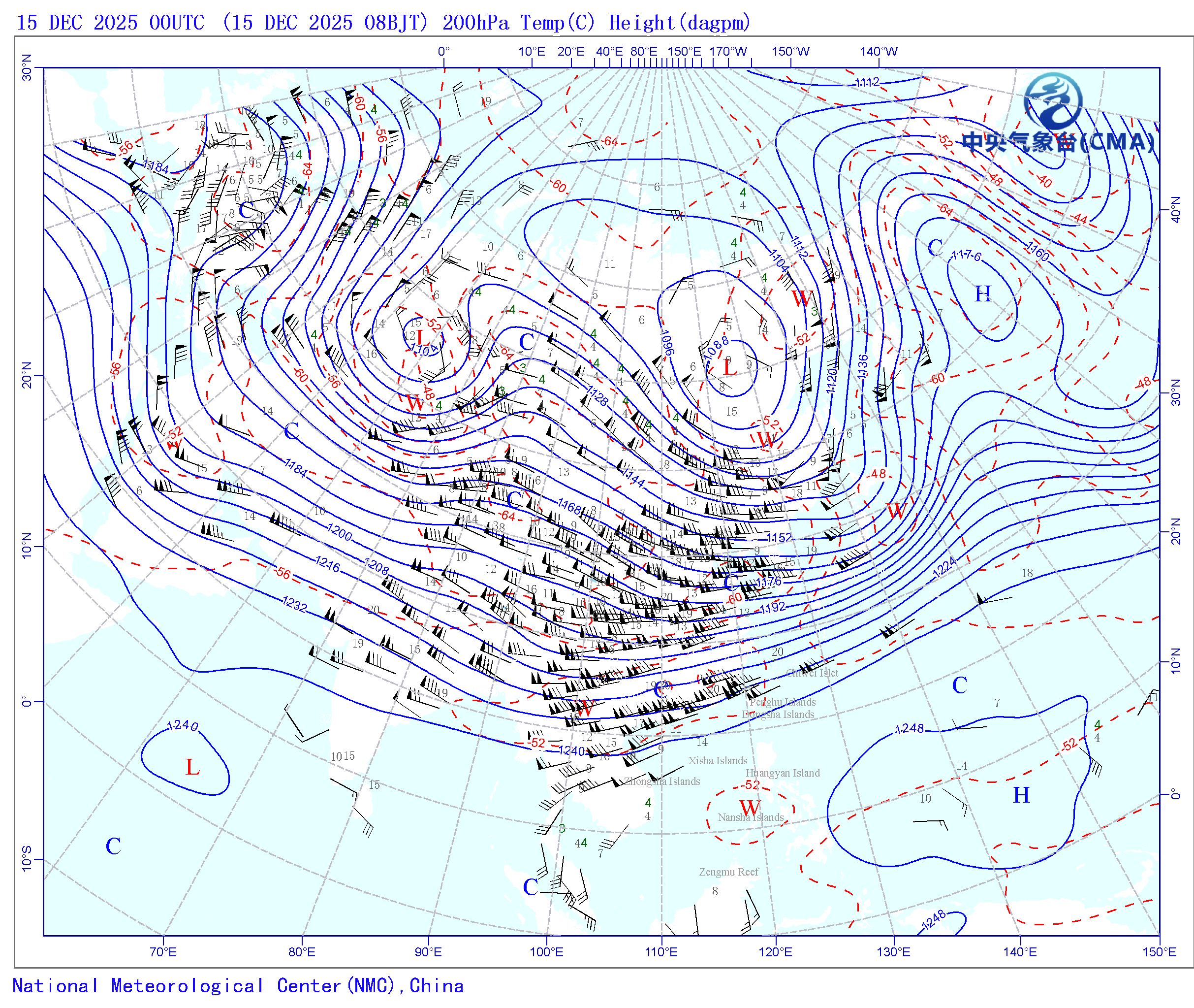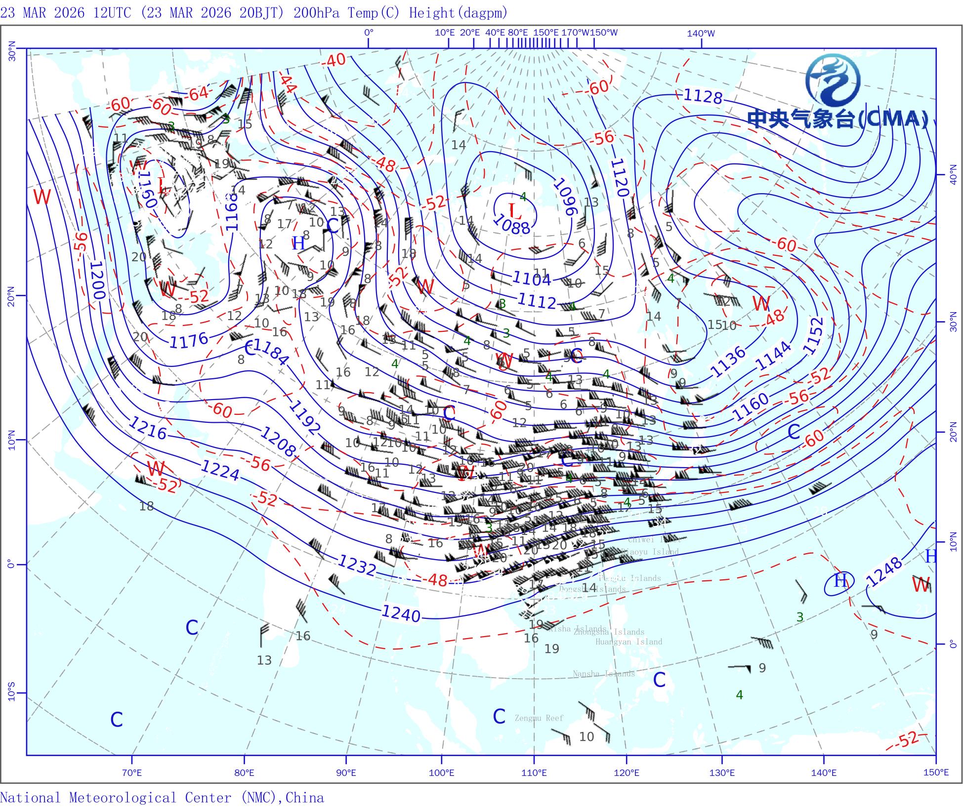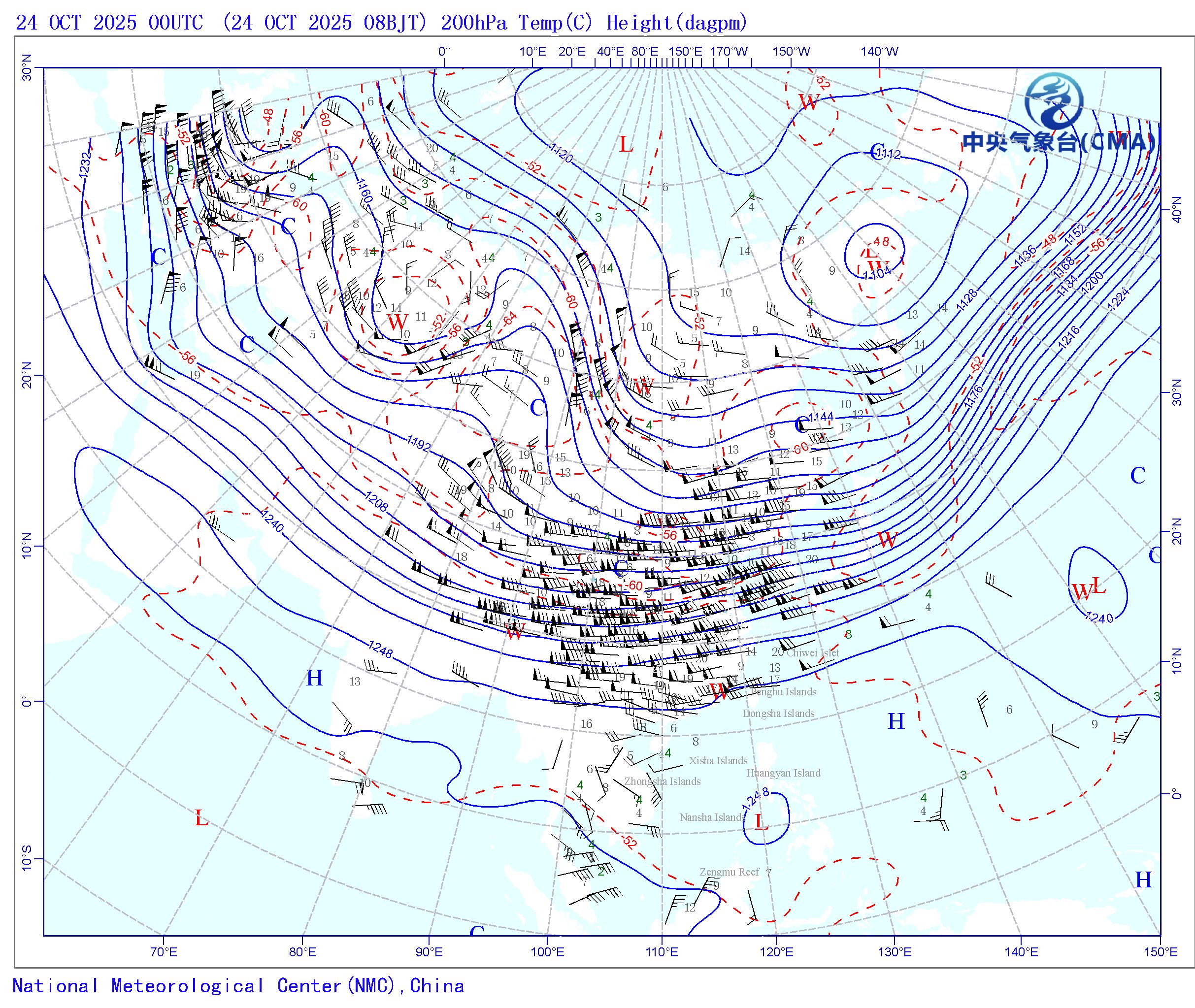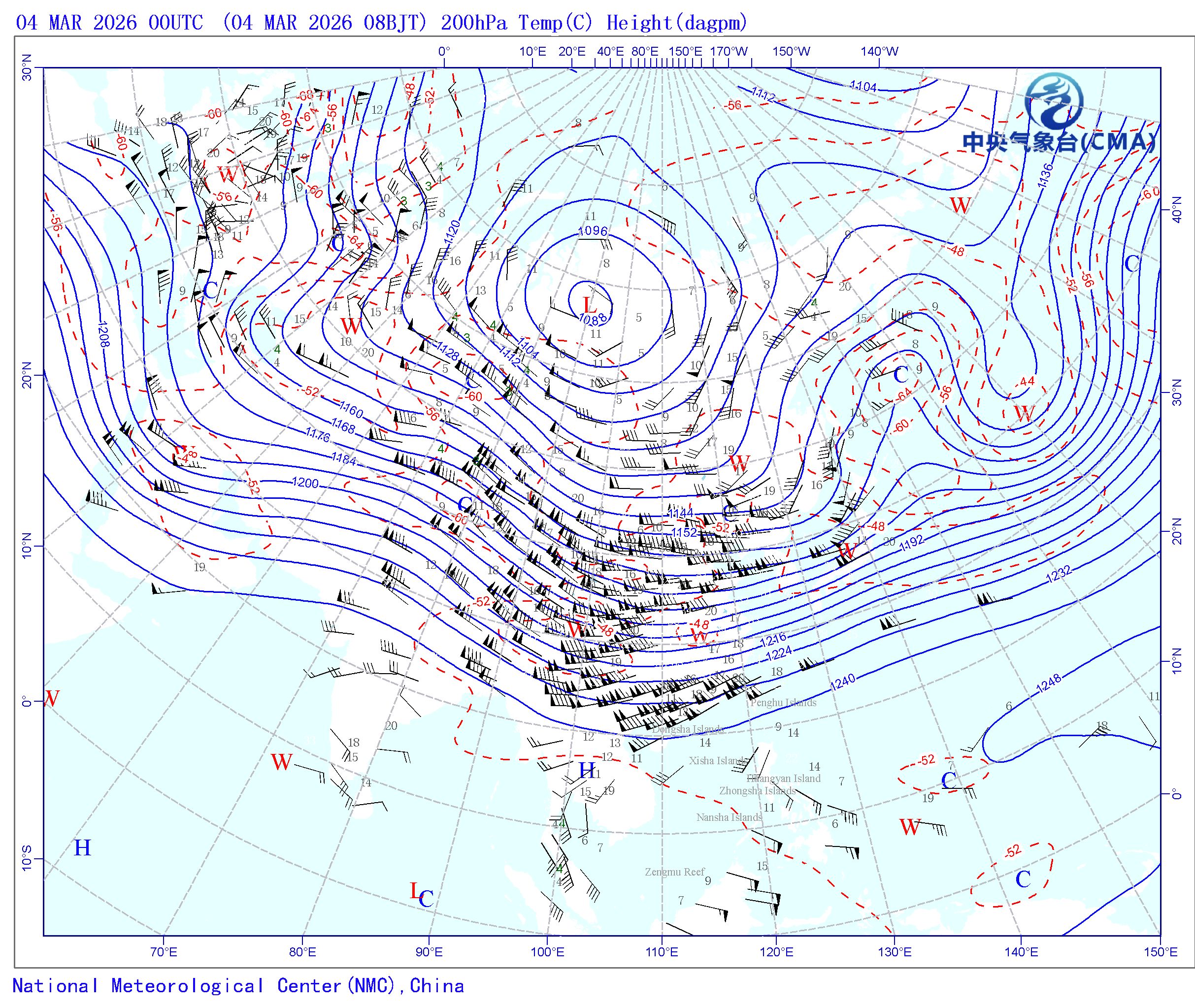 站点的填图要素包括:风向风速和温度露点差;天气系统符号包括:高压中心(H)、低压中心(L)、暖中心(W)、冷中心(C)和台风符号;蓝色等值线为等高线(单位dagpm);红色等值线为等温线(单位℃),其中零摄氏度以下以虚线显示。