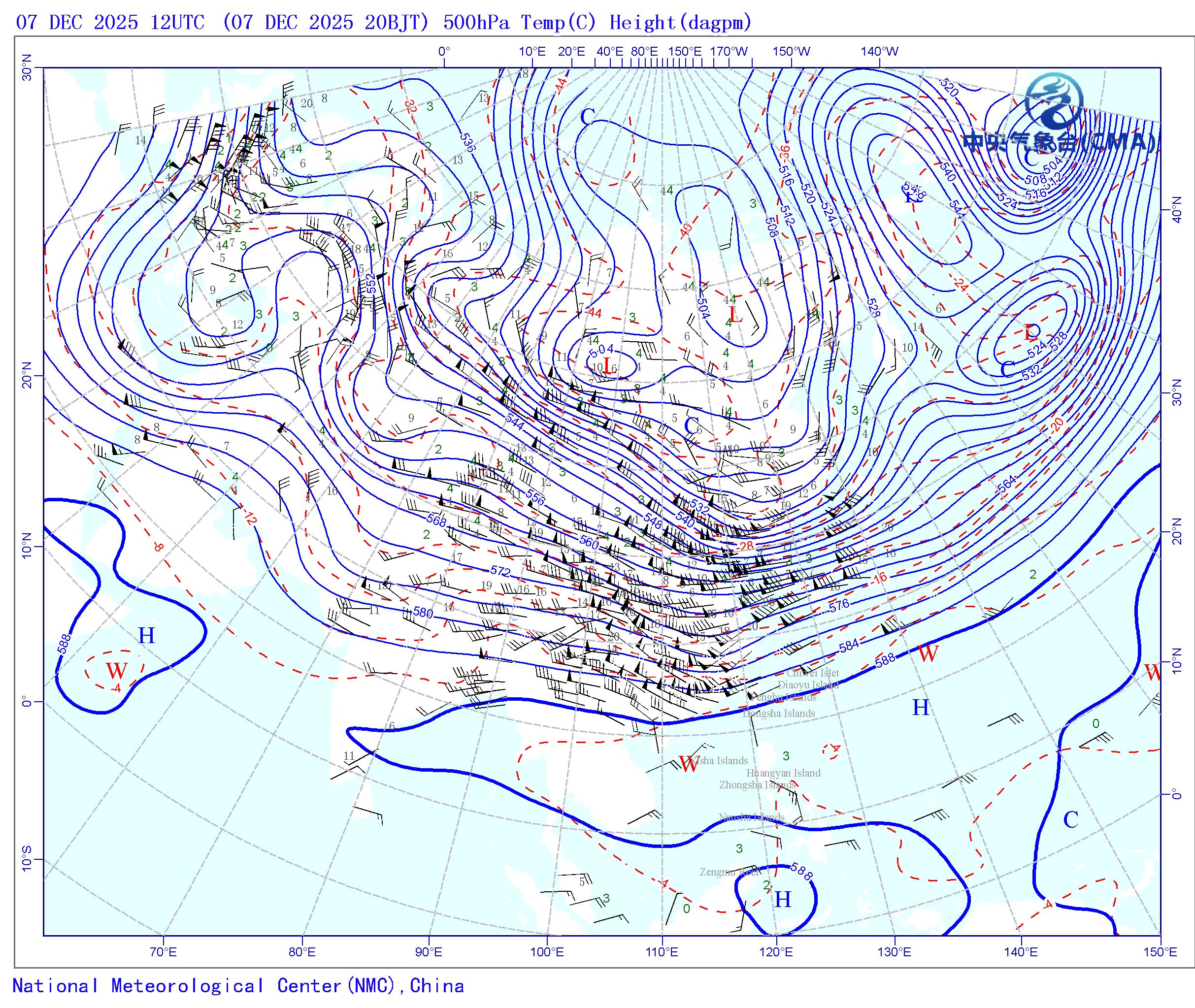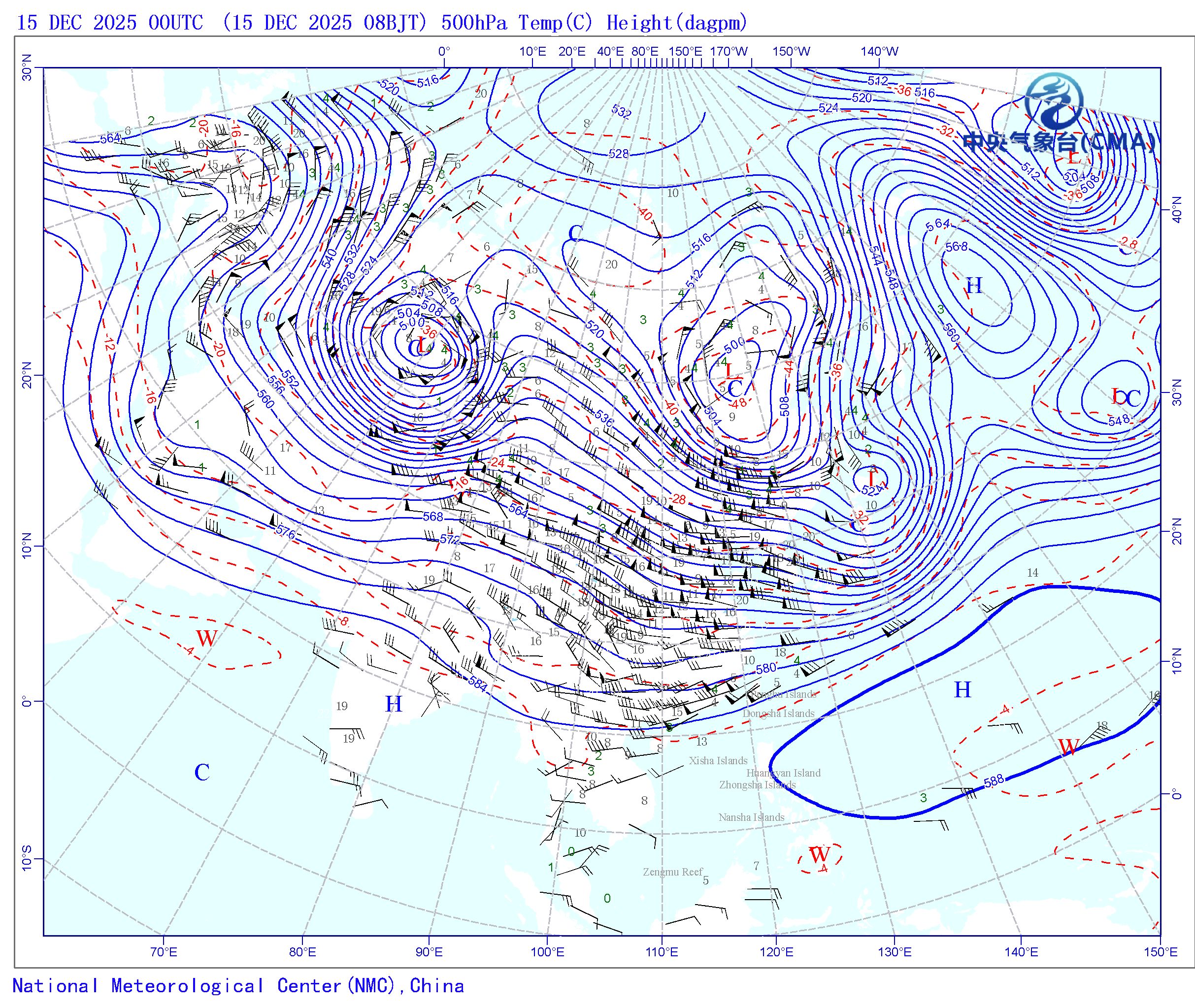 站点的填图要素包括:风向风速和温度露点差;天气系统符号包括:高压中心(H)、低压中心(L)、暖中心(W)、冷中心(C)和台风符号;蓝色等值线为等高线(单位dagpm);红色等值线为等温线(单位℃),其中零摄氏度以下以虚线显示。
