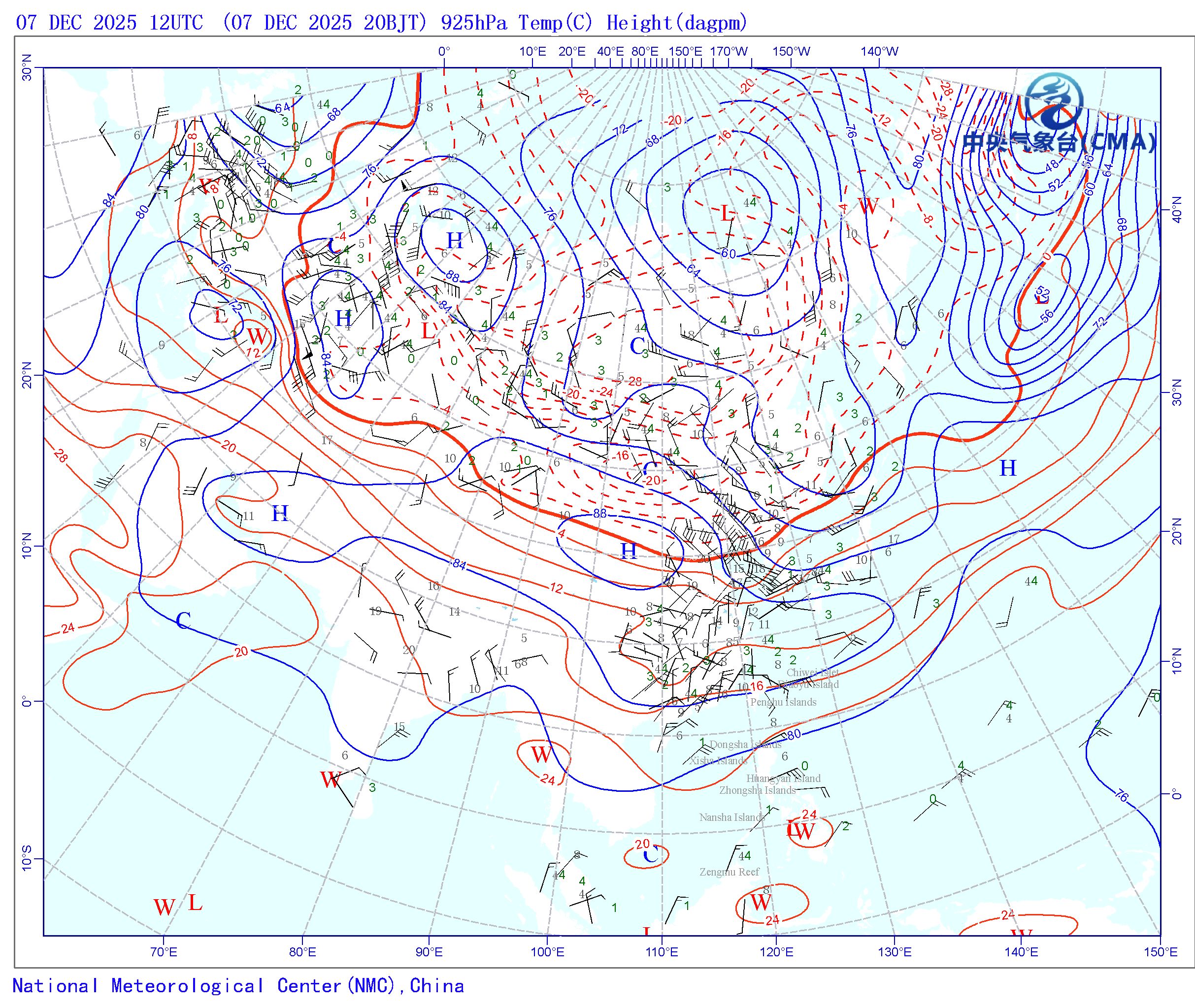站点的填图要素包括:风向风速和温度露点差;天气系统符号包括:高压中心(H)、低压中心(L)、暖中心(W)、冷中心(C)和台风符号;蓝色等值线为等高线(单位dagpm);红色等值线为等温线(单位℃),其中零摄氏度以下以虚线显示。