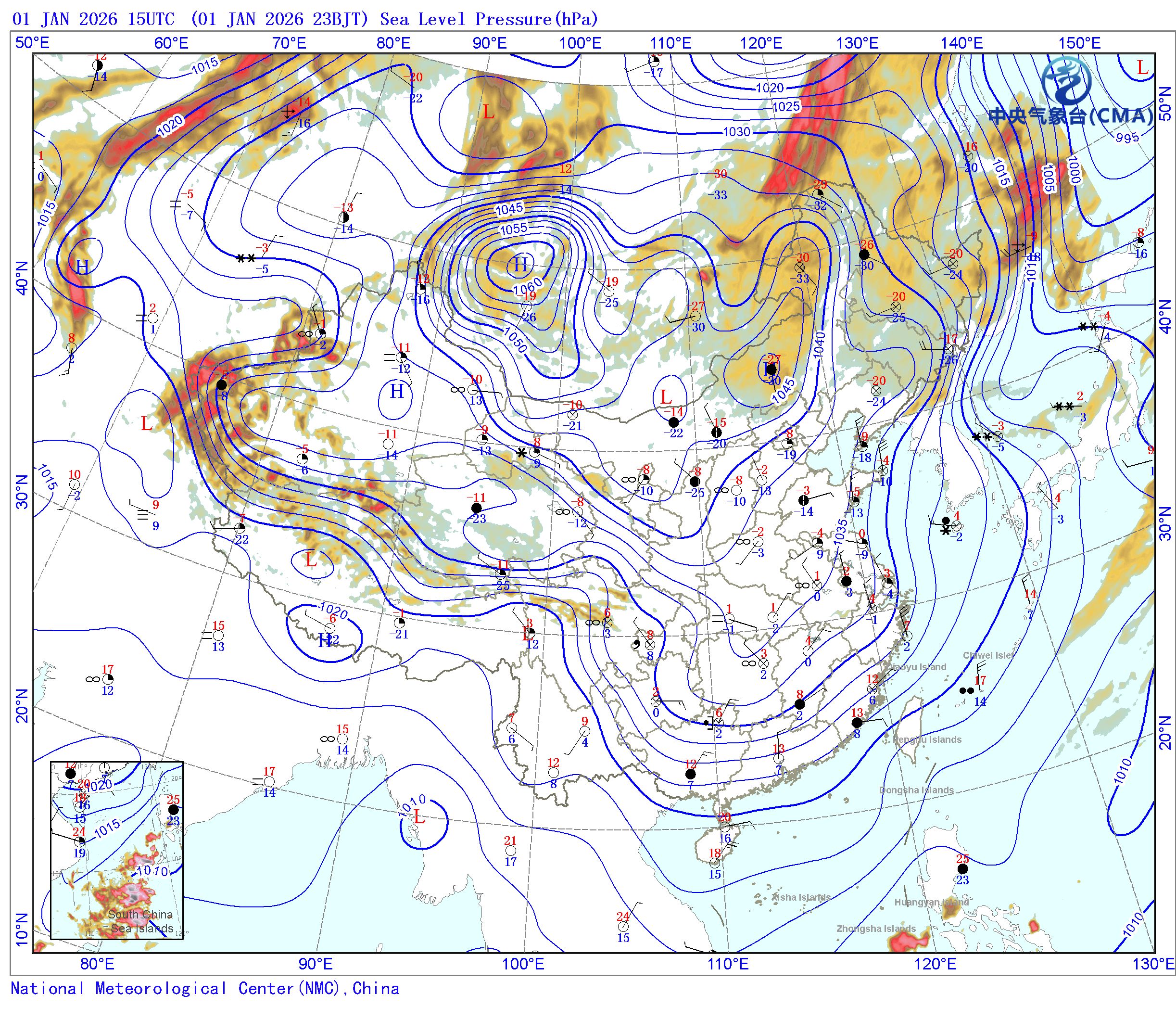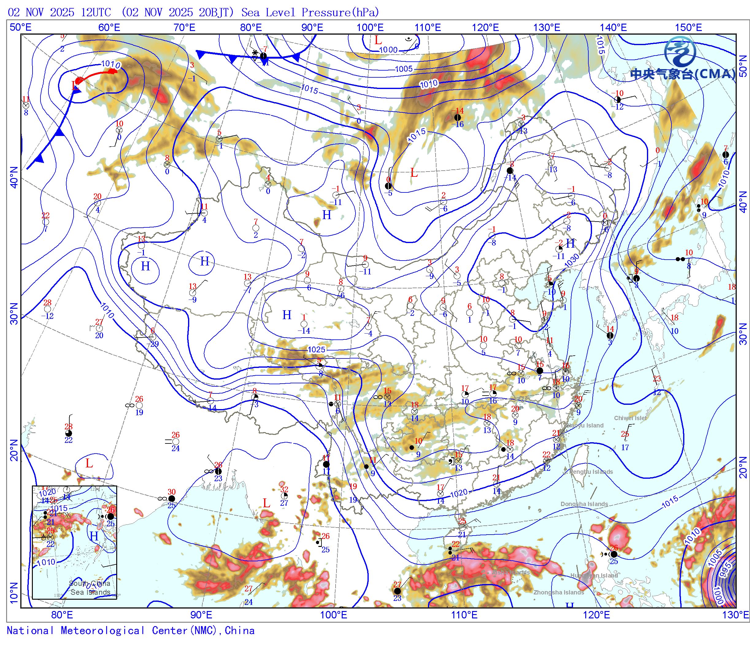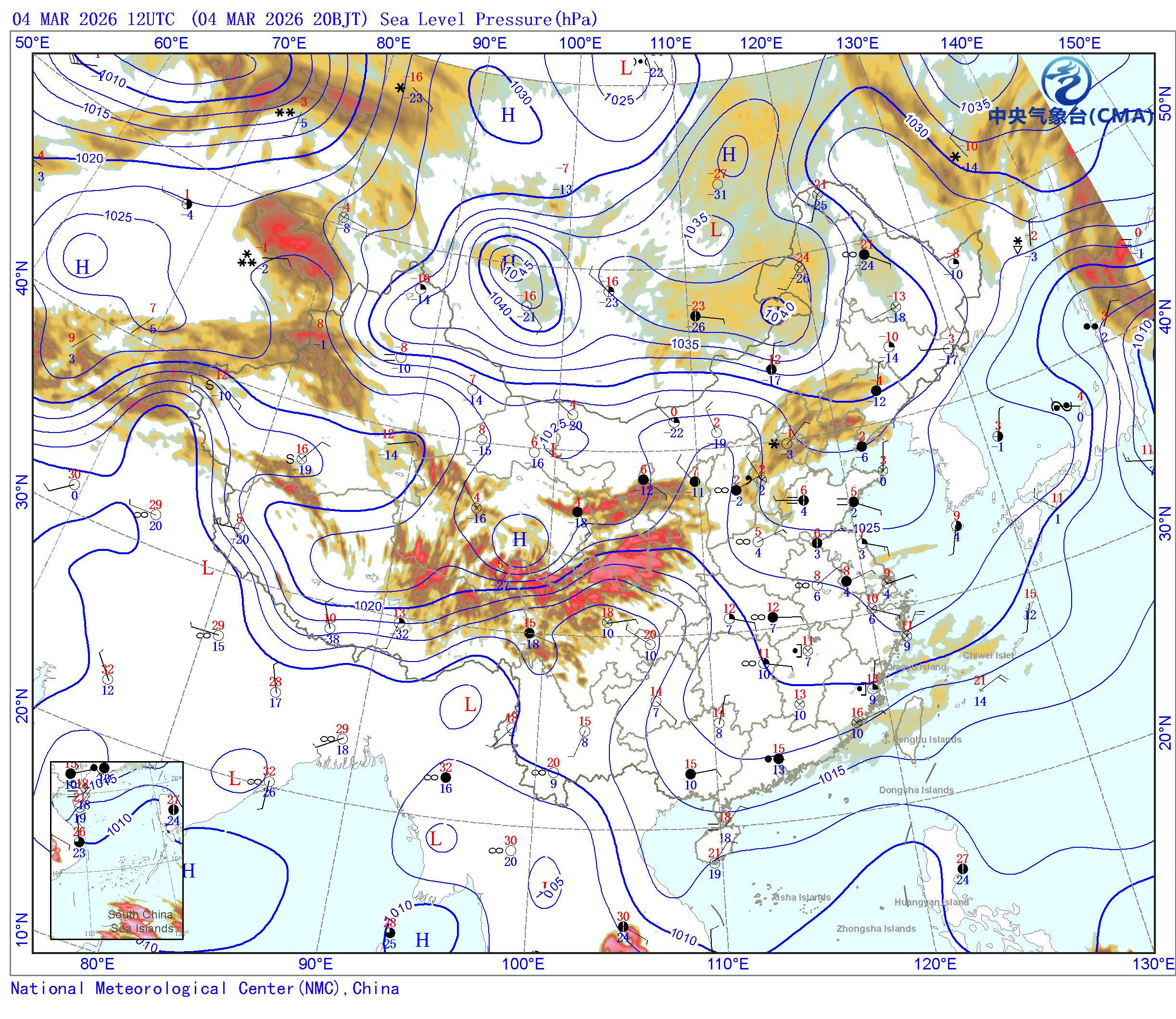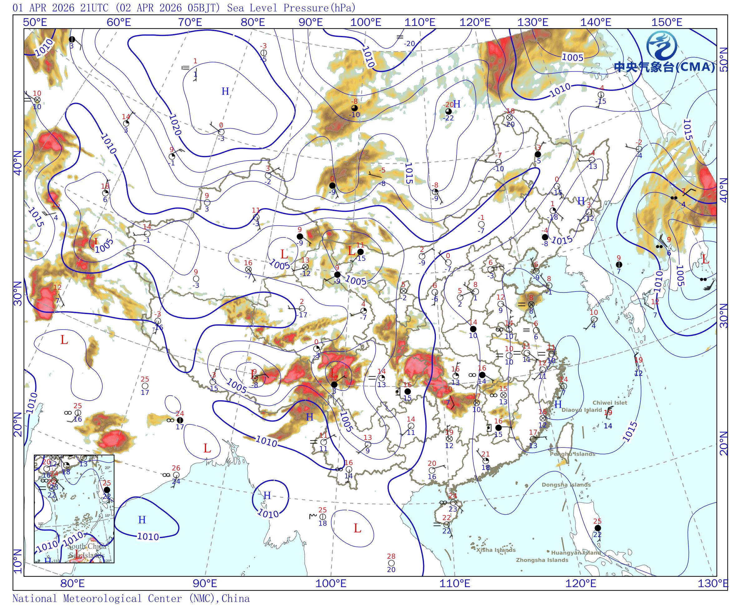 站点的填图要素包括:云量、风向风速、天气现象、温度(红色数字)和露点(蓝色数字);天气系统符号包括:高压中心(H)、低压中心(L)、冷锋(带三角形蓝色线段)、暖锋(带半圆形红色线段)和台风符号;蓝色等值线为海平面气压场等压线(单位hPa);底层填色为地形高度;顶层填色为红外卫星云图。