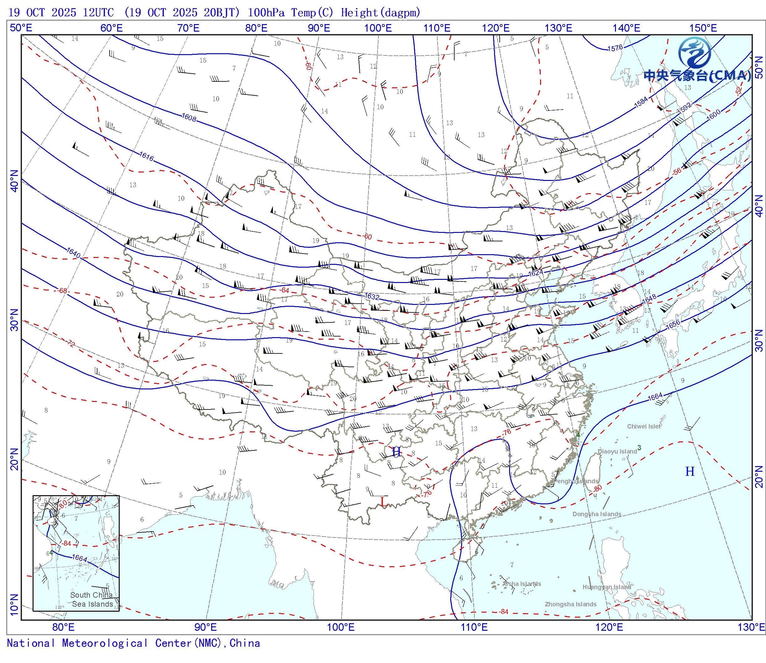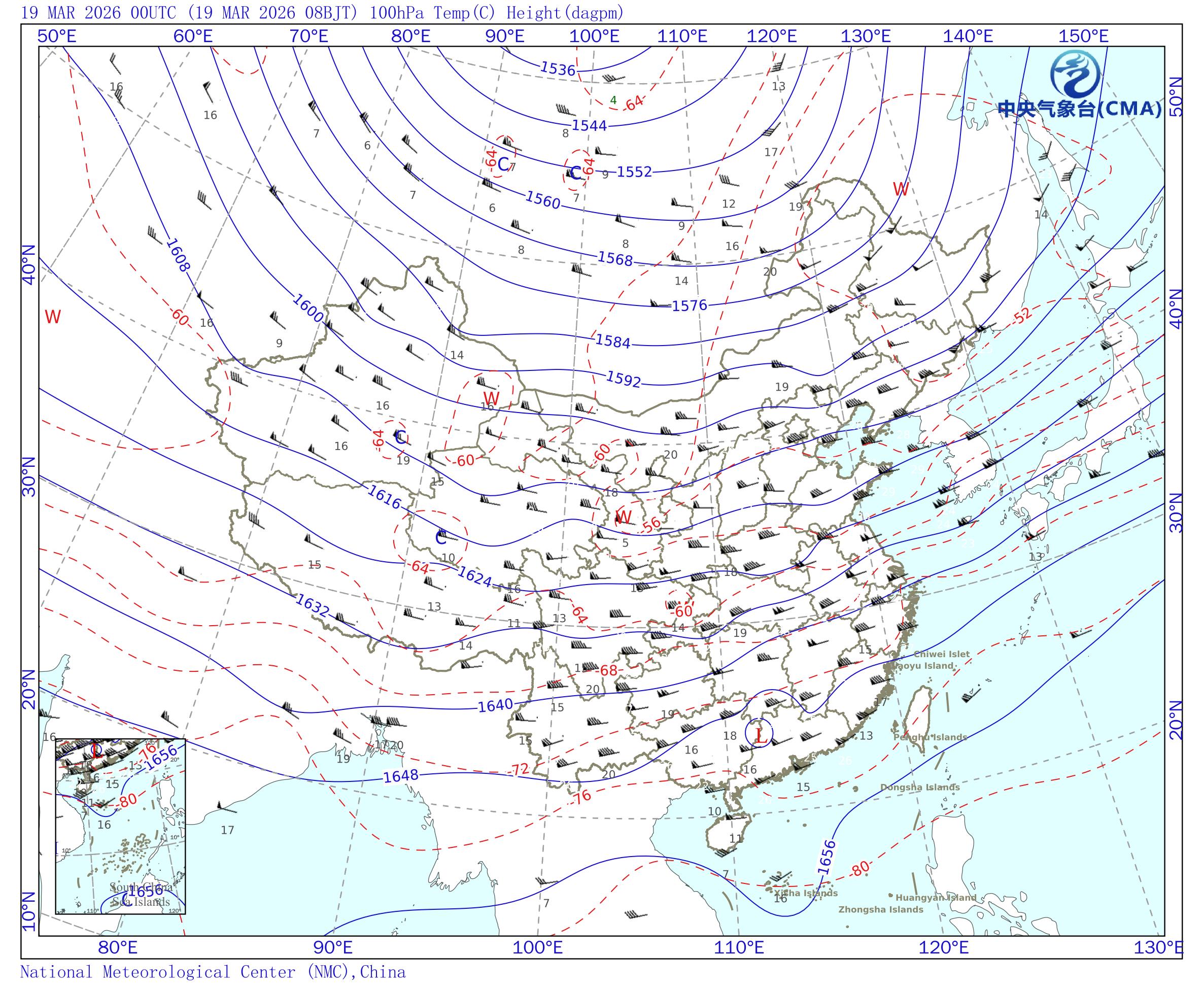 站点的填图要素包括:风向风速和温度露点差;天气系统符号包括:高压中心(H)、低压中心(L)、暖中心(W)、冷中心(C)和台风符号;蓝色等值线为等高线(单位dagpm);红色等值线为等温线(单位℃),其中零摄氏度以下以虚线显示。