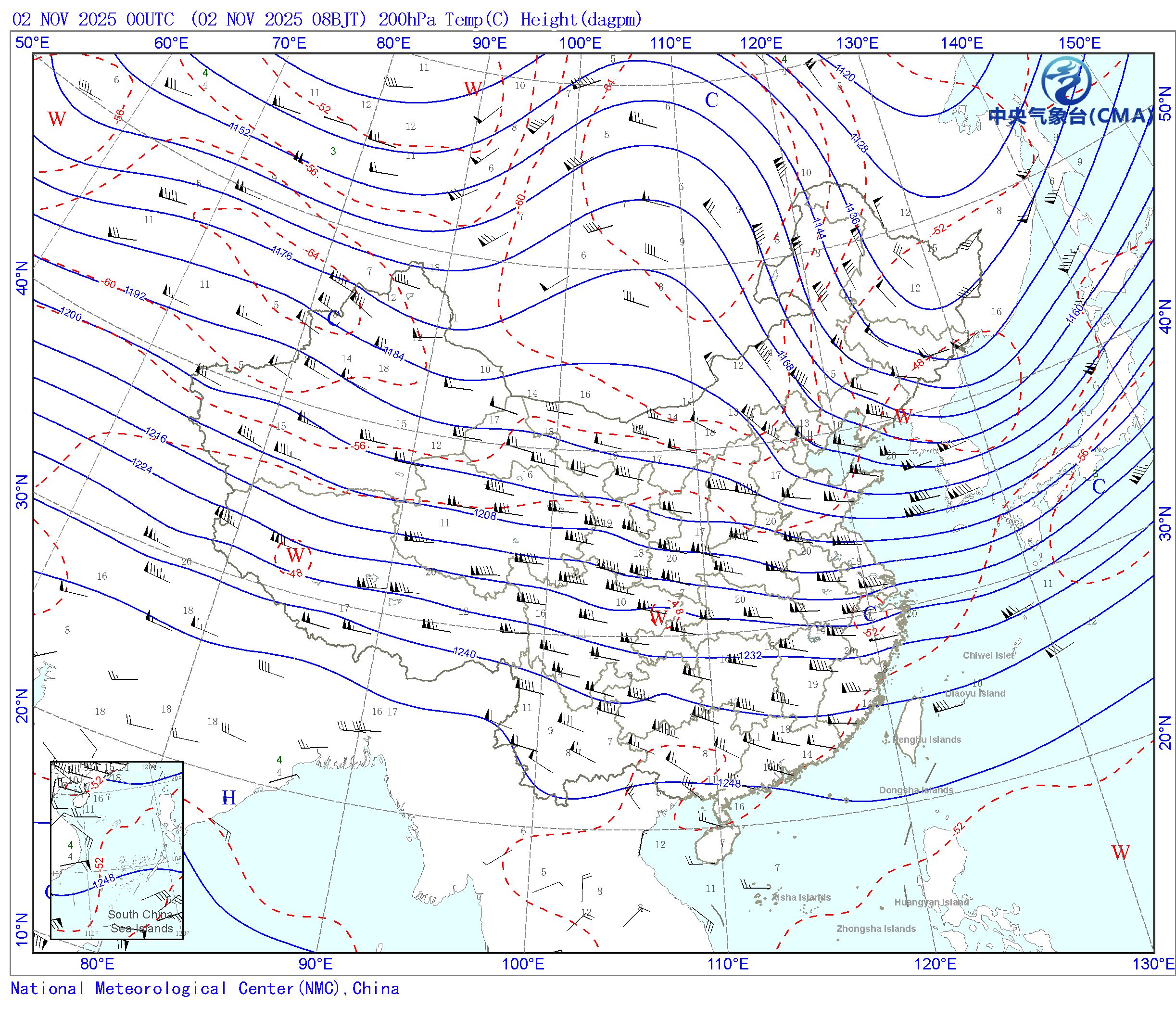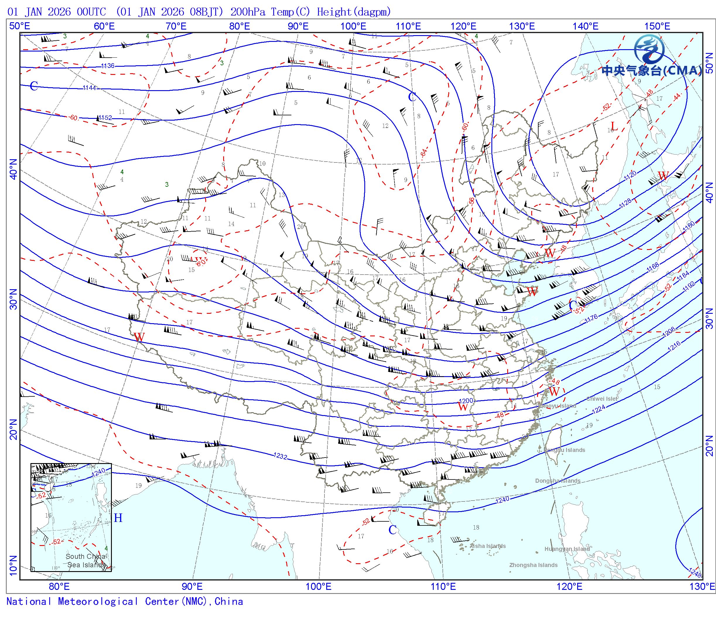 站点的填图要素包括:风向风速和温度露点差;天气系统符号包括:高压中心(H)、低压中心(L)、暖中心(W)、冷中心(C)和台风符号;蓝色等值线为等高线(单位dagpm);红色等值线为等温线(单位℃),其中零摄氏度以下以虚线显示。