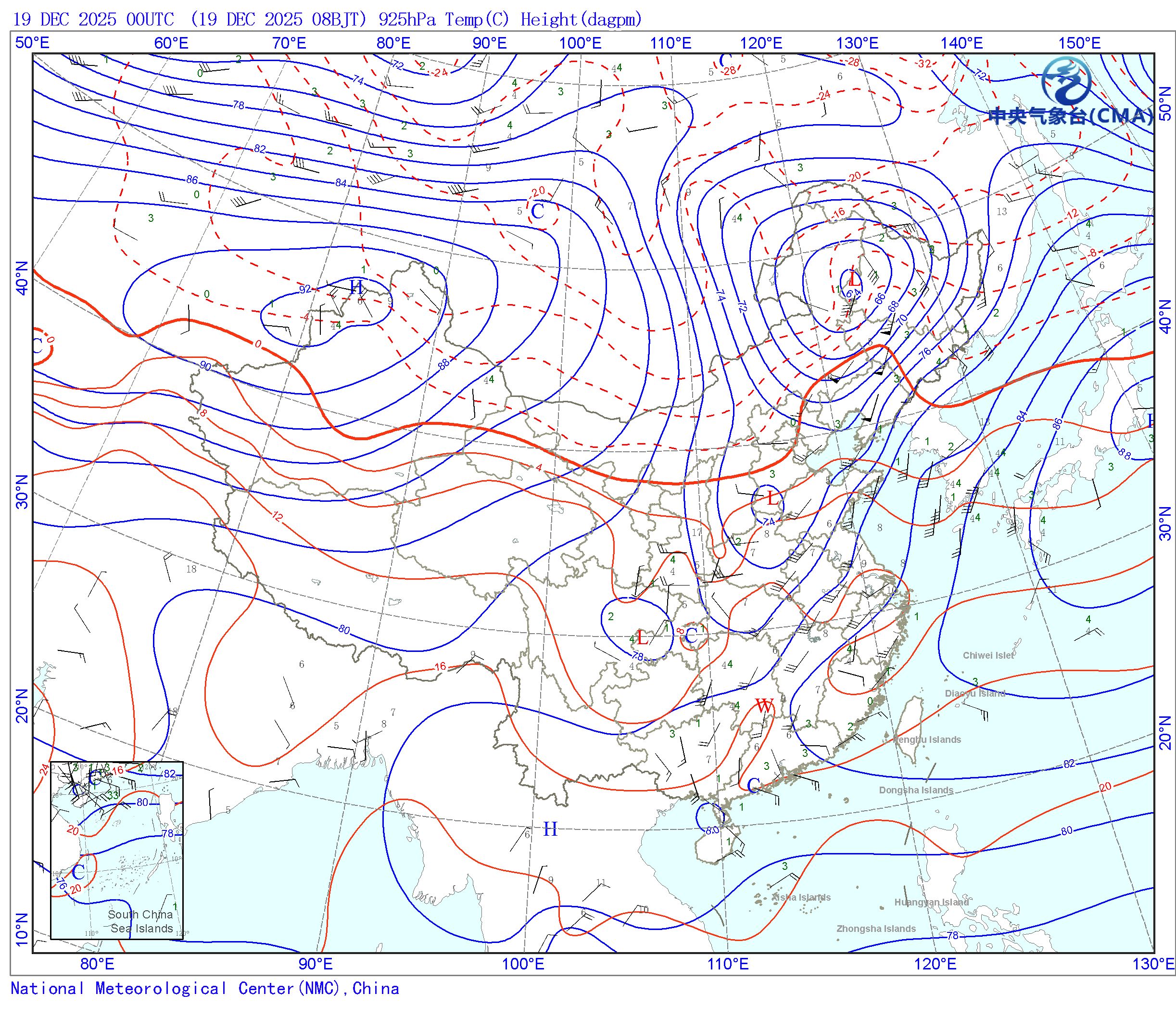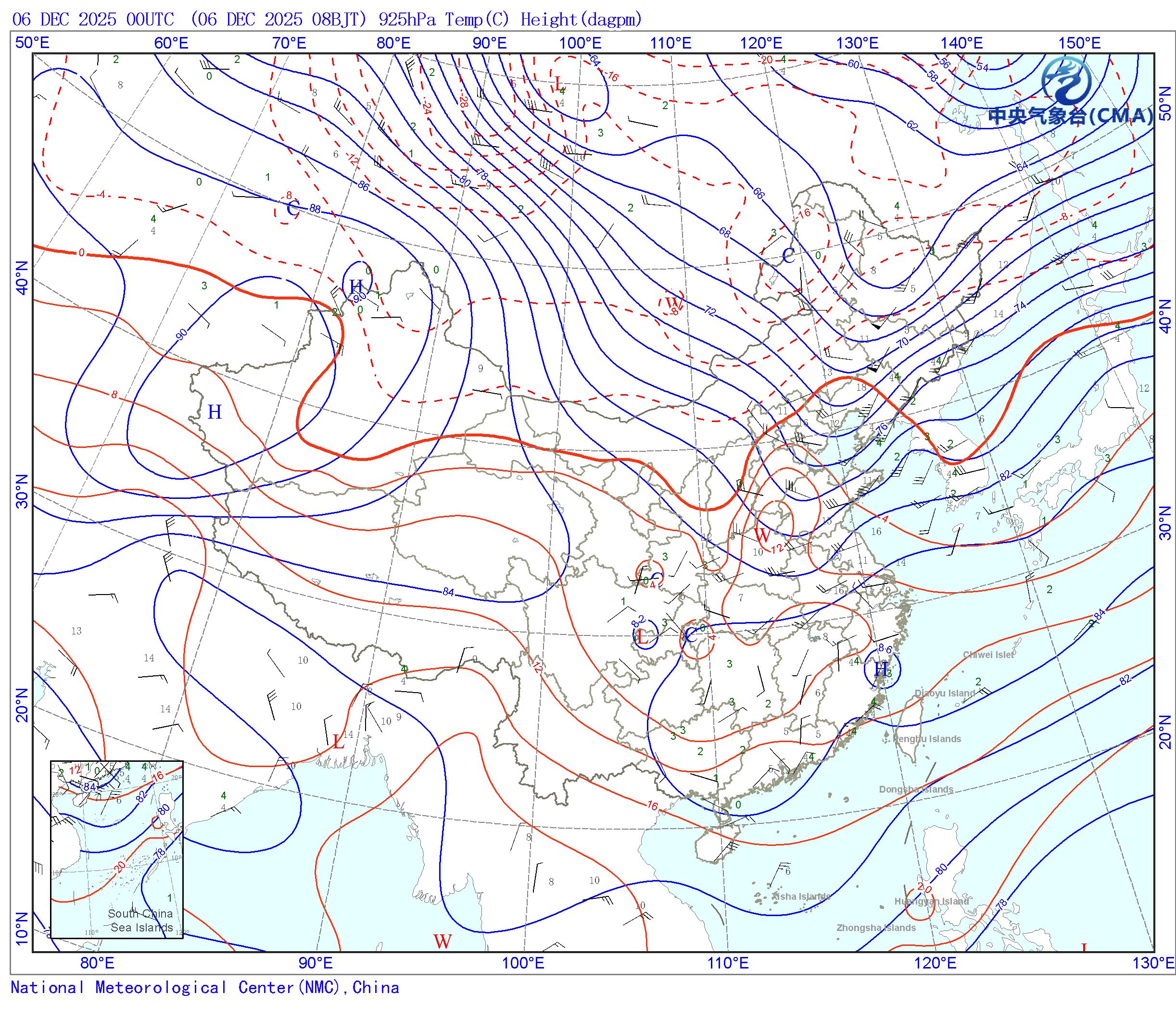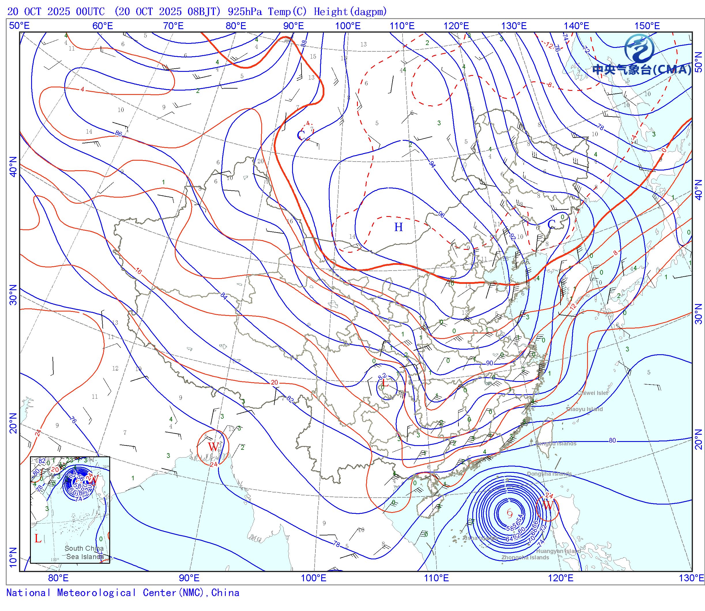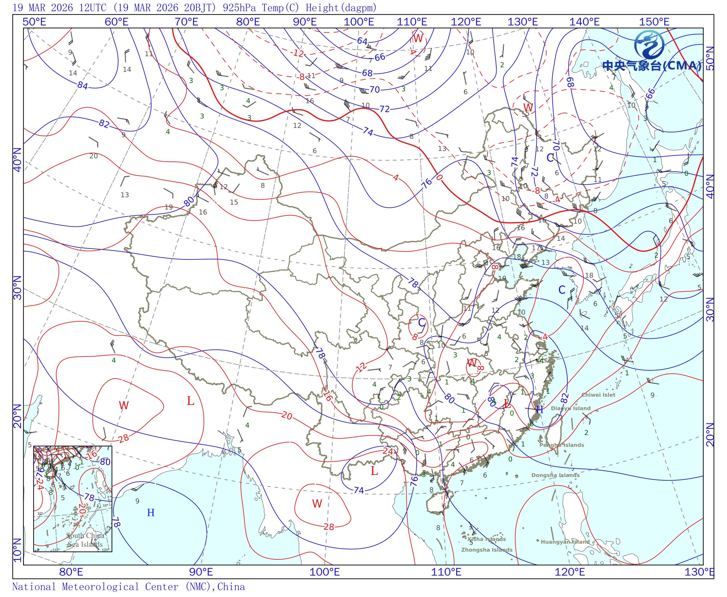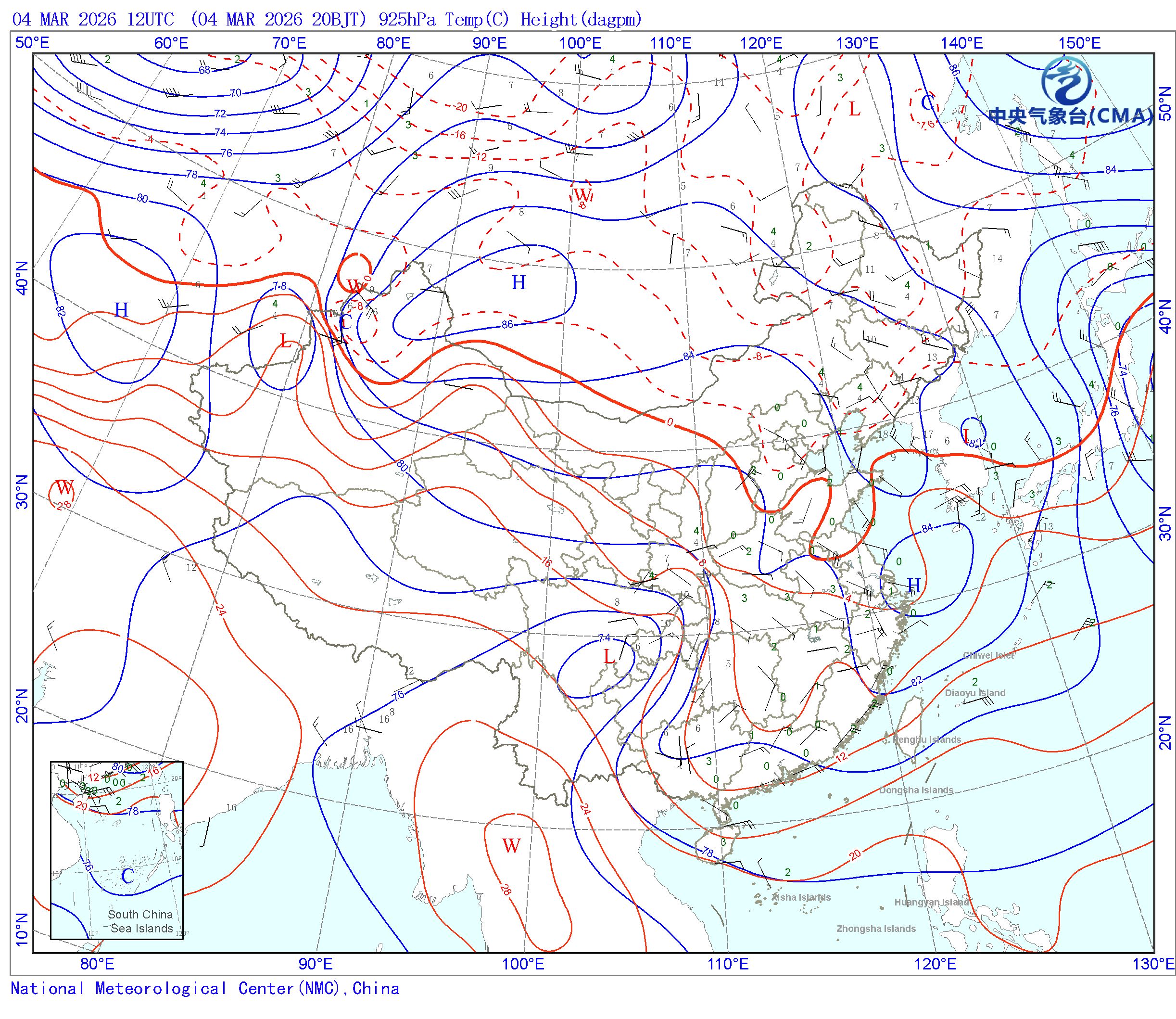 站点的填图要素包括:风向风速和温度露点差;天气系统符号包括:高压中心(H)、低压中心(L)、暖中心(W)、冷中心(C)和台风符号;蓝色等值线为等高线(单位dagpm);红色等值线为等温线(单位℃),其中零摄氏度以下以虚线显示。