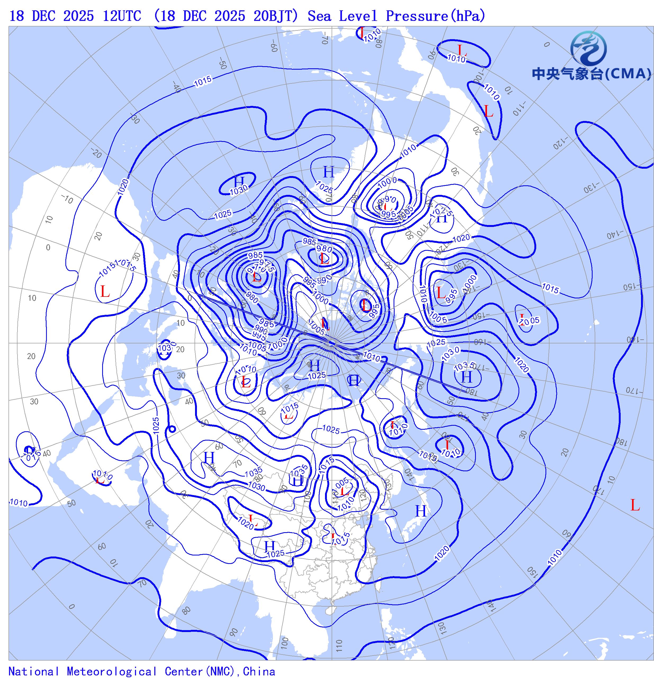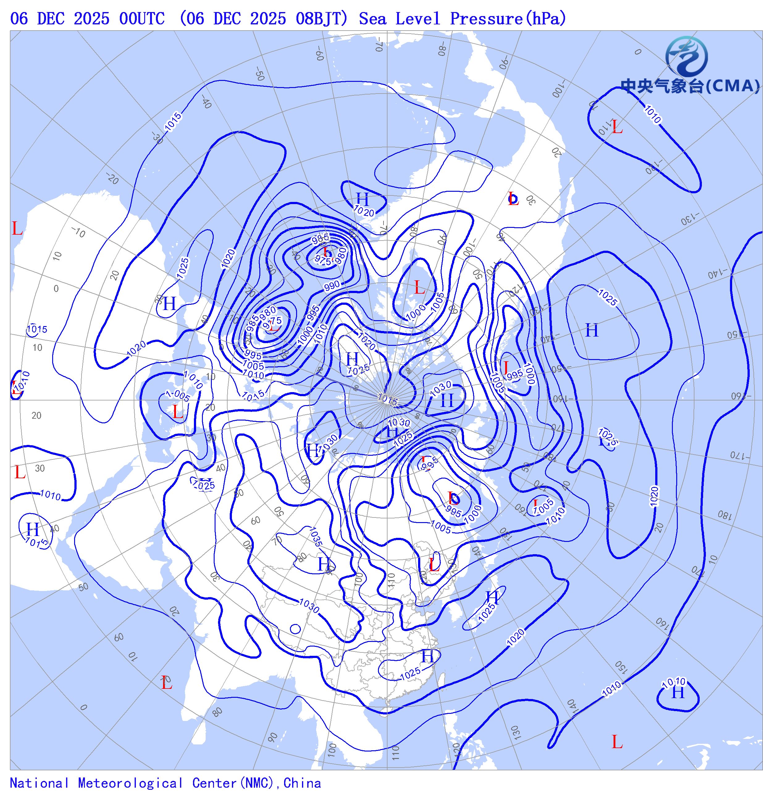 天气系统符号包括:高压中心(H)、低压中心(L)和台风符号;蓝色等值线为海平面气压场等压线(单位hPa)。