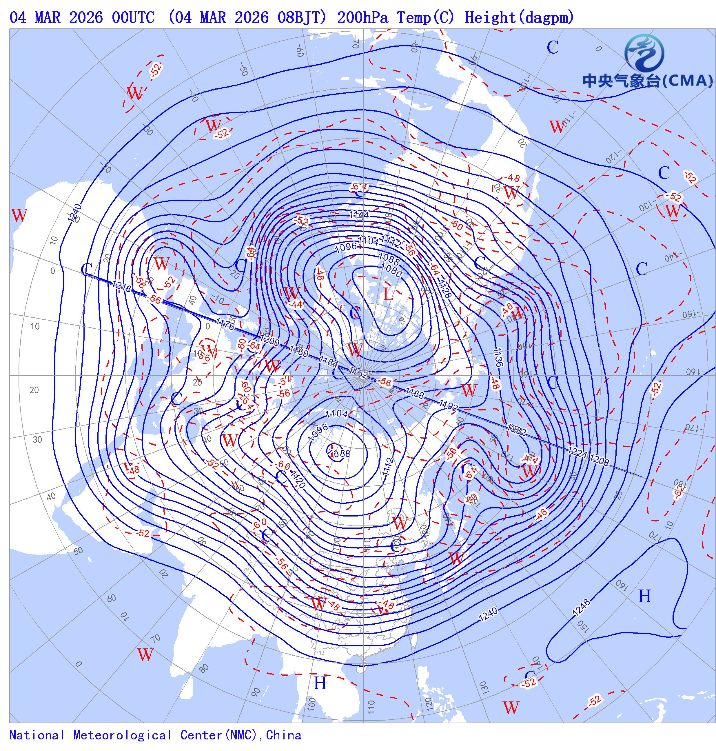 天气系统符号包括:高压中心(H)、低压中心(L)、暖中心(W)、冷中心(C)和台风符号;蓝色等值线为等高线(单位dagpm);红色等值线为等温线(单位℃),其中零摄氏度以下以虚线显示。