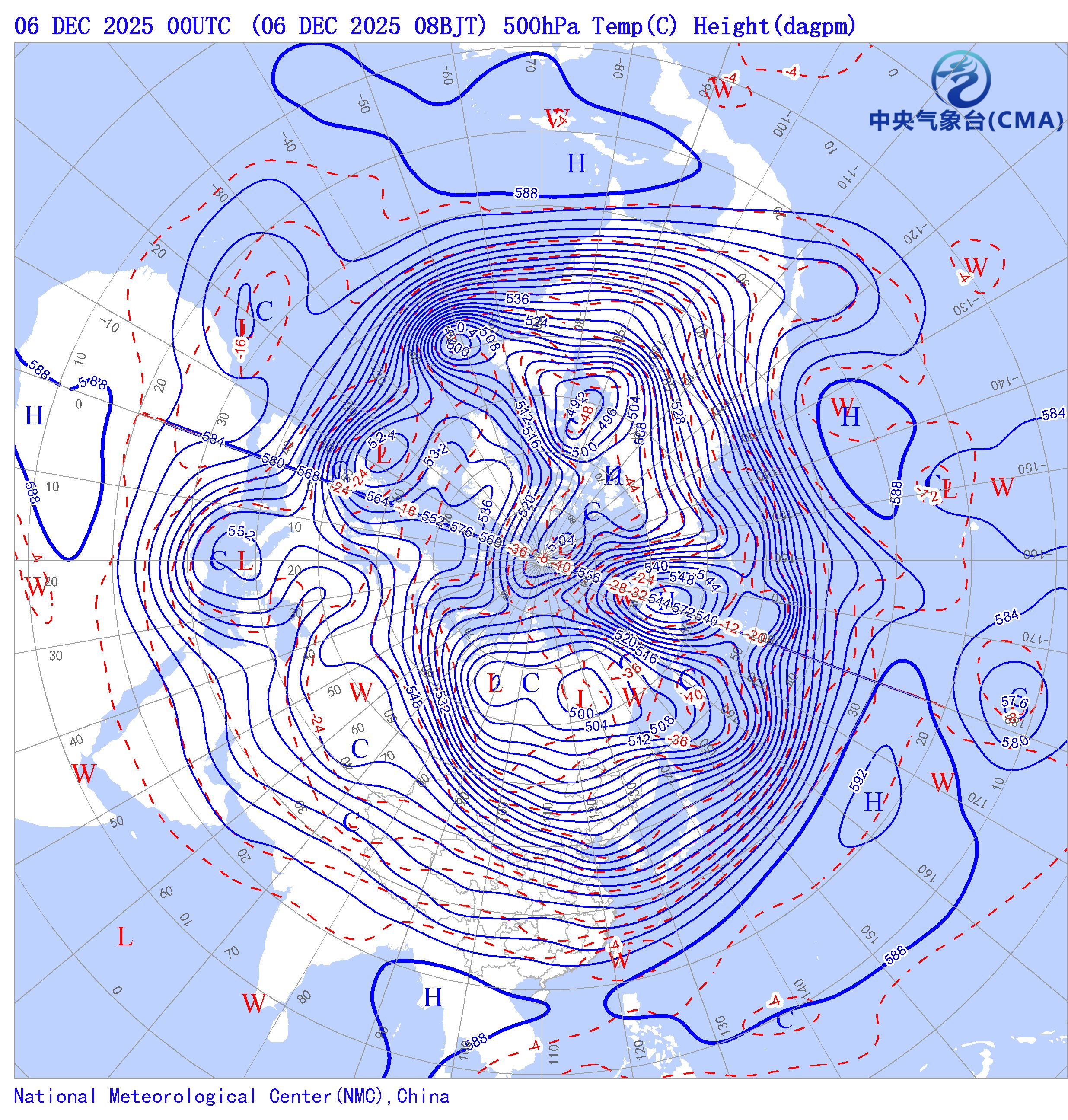 天气系统符号包括:高压中心(H)、低压中心(L)、暖中心(W)、冷中心(C)和台风符号;蓝色等值线为等高线(单位dagpm);红色等值线为等温线(单位℃),其中零摄氏度以下以虚线显示。