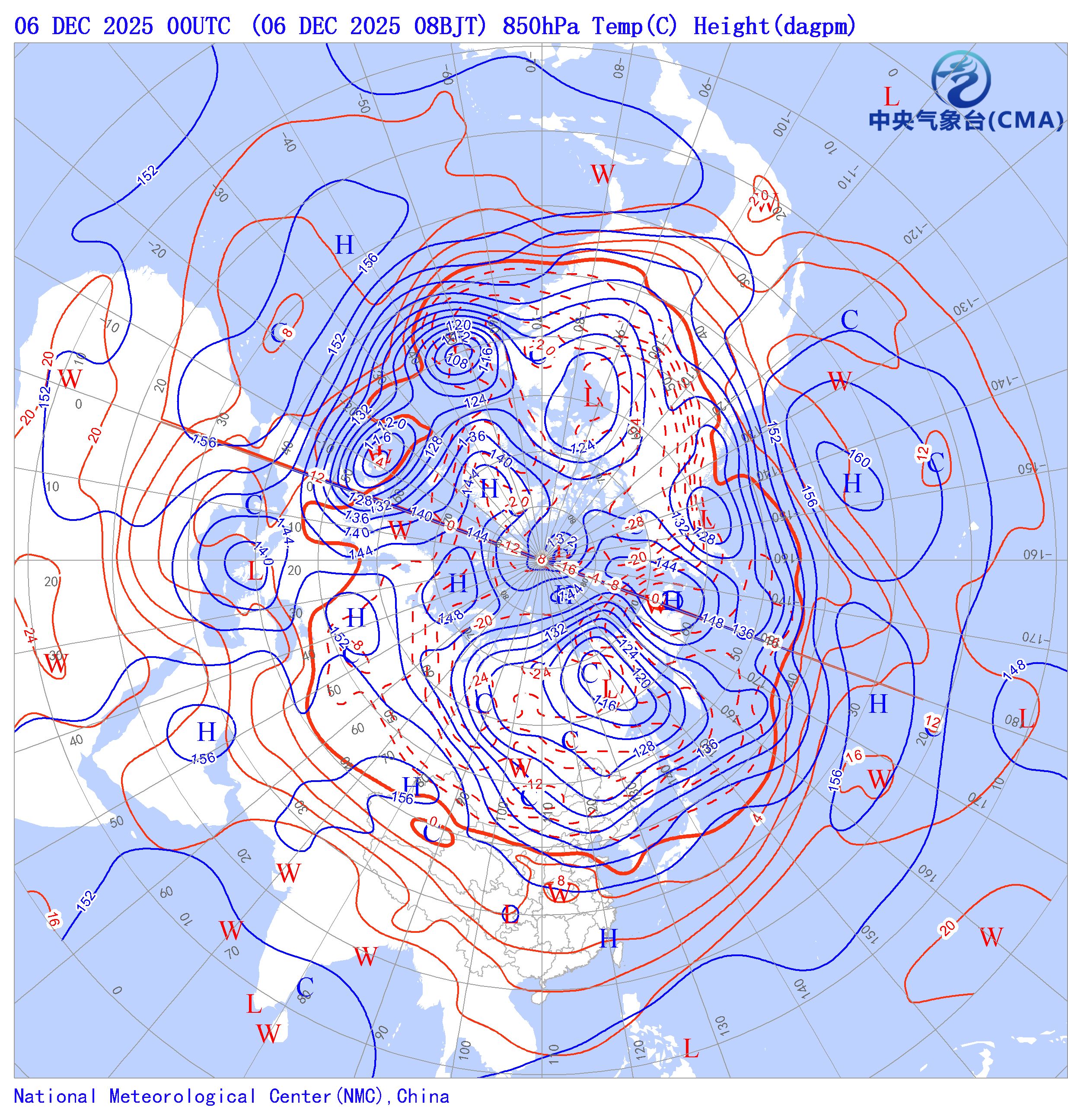 天气系统符号包括:高压中心(H)、低压中心(L)、暖中心(W)、冷中心(C)和台风符号;蓝色等值线为等高线(单位dagpm);红色等值线为等温线(单位℃),其中零摄氏度以下以虚线显示。