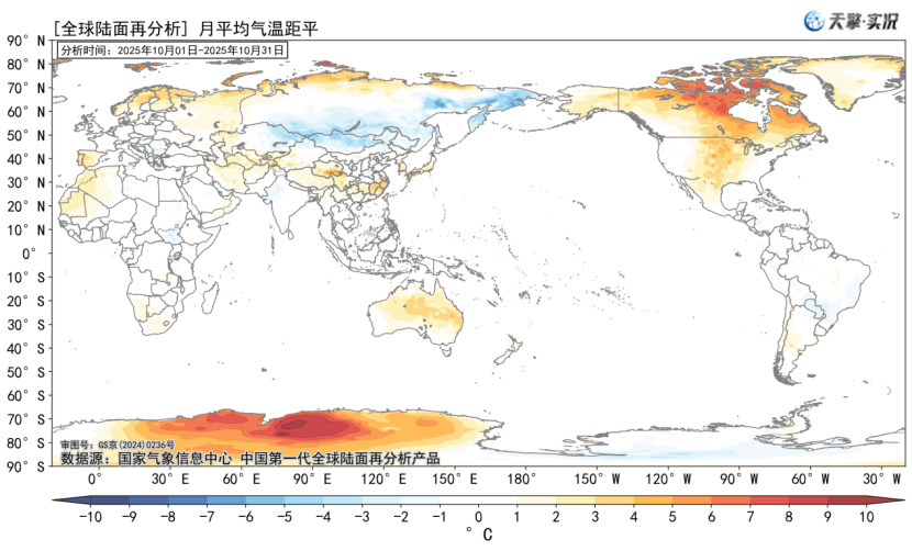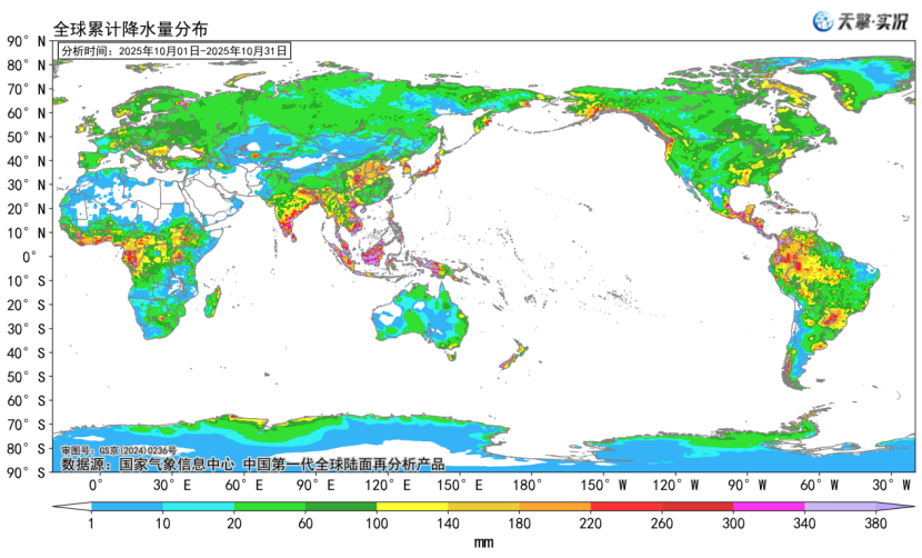 2025年10月,欧洲西部和南部、非洲中南部、中亚东南部、南亚中东部、东南亚、东亚东部、澳大利亚东部及新西兰、北美洲东部和南部及加拿大西部沿海地区、南美洲大部等地累计降水量有60~180毫米,其中非洲中部、南亚中东部、东南亚热带群岛、东亚东部、新西兰、墨西哥、南美洲西北部及巴西南部等地的部分地区降水量有220~300毫米,局地350毫米以上(图3)。除了欧洲南部、南亚、东亚中北部、俄罗斯东北部、加拿大东部、美国西部、格陵兰岛北部和西部等地累计降水量较常年同期偏多5成~1倍,局地偏多2倍以上外,其他大部地区降水量显著偏少(图4)。