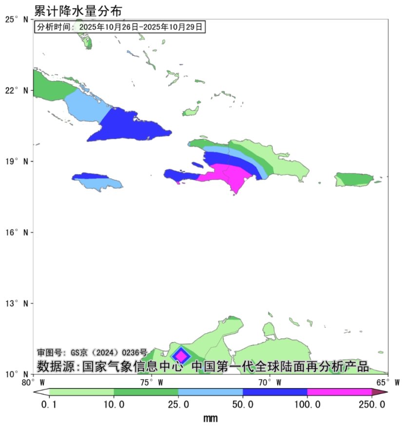 飓风“梅利莎”于2025年10月21日在加勒比地区形成。生成后初期数日其强度发展缓慢,10月25日起其强度迅速发展增强,至10月27日升级为最高级别的五级飓风(相当于中国超强台风级),10月28日,“梅利莎”超过台风“桦加沙”成为2025年全球最强热带气旋,同日达到风速82 m/s、气压892百帕的极值强度。北京时间10月29日凌晨1时左右,“梅利莎”在牙买加西南部海岸登陆,成为有记录以来登陆牙买加的最强飓风(图10)。受其影响,牙买加沿海出现了17级以上大风。凌晨3时左右,“梅利莎”以三级飓风,51米/秒的强度再次在古巴东南部圣地亚哥省二次登陆,古巴东南部沿海出现了15~16级风,阵风17级。10月31日夜间“梅利莎”变性为温带气旋。10月26-29日,牙买加北部、古巴圣地亚哥东部、海地、多米尼加西部累计降雨量超过50毫米,其中海地东南部、多米尼加西南部部分地区超过100毫米(图11)。