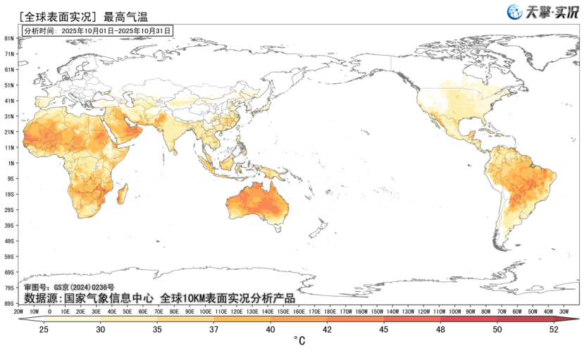 2025年10月,欧洲北部和东部、非洲西部和南部、西亚北部、中亚西部和南部、东亚南部和东部、俄罗斯北部、澳大利亚大部、北美洲大部等地平均气温较常年同期偏高1~3℃,其中北美洲局地偏高4~6℃;俄罗斯南部和东部的部分地区气温偏低2~4℃,局地偏低5℃以下;其他大部地区气温接近常年(图1)。非洲北部和南非北部、西亚东部和阿拉伯半岛、东南亚热带群岛、澳大利亚、南美洲中部等地有37℃以上的高温天气,局地超过42℃(图2)。