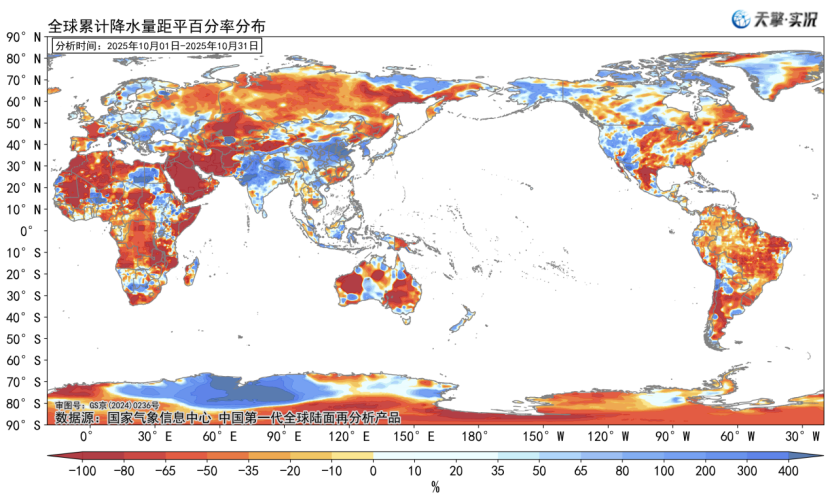 图4 2025年10月全球累计降水量距平百分率(单位:%)