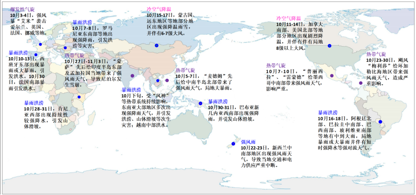 2025年10月,全球多地出现了暴雨洪涝、热带气旋、爆发性气旋、寒潮大风等多种灾害性天气(图5)。北半球受强盛的偏北副热带高压影响,低纬热带对流系统仍然较为活跃,其中,在10月上旬和下旬,先后受台风“麦德姆”、“风神”影响,中南半岛大部地区遭遇了强风雨天气,引发洪涝、山体滑坡等次生灾害,给当地人民生命财产安全造成了严重影响。此外,10月7-10日,受飓风“普丽西拉”与“雷蒙德”影响,墨西哥中南部遭遇持续性强降雨天气,造成上百人遇难和失踪。10月下旬,北大西洋飓风“梅丽莎”、孟湾风暴“蒙萨”则先后给环加勒比海地区、印度半岛等地造成了严重的风雨影响和人员伤亡。此外,在西班牙、肯尼亚、巴布亚新几内亚、新西兰、南美洲中部等国家和地区均发生了较为严重的暴雨洪涝事件,严重威胁了当地人民的生产生活与生命安全。同时,10月中旬,在北美、蒙古、远东地区等地先后出现了强降温雨雪与大风天气,给当地电力设施、交通出行等行业造成了严重影响。