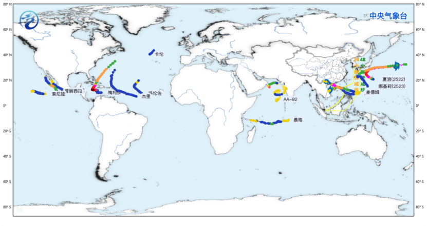 北大西洋 | 梅利莎/MELISSA | 五级飓风 | 10月21日-31日 | 10月29日00时前后登陆牙买加西南部沿海;15时前后登陆古巴东南部圣地亚哥省沿海。 |