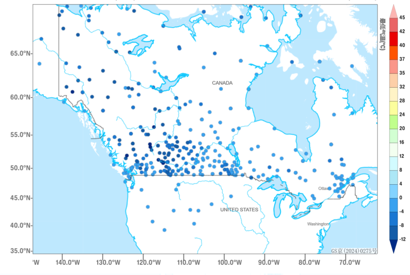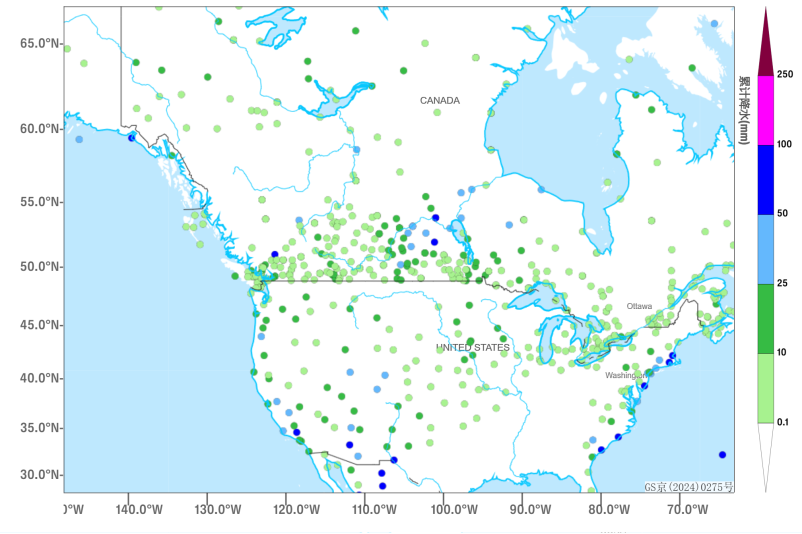 2025年10月11-14日,受冷空气影响,美国北部、加拿大南部出现8~12℃降温,局地降温14℃以上,部分地区伴有6-7级,局地8级以上大风。加拿大、美国西北部最低气温在0℃以下,其中加拿大西部最低气温达到-8℃以下(图7);并伴有小到中雪,局地大雪,加拿大南部局地暴雪或大暴雪,局部地区累计降水量有10~30mm,加拿大南部局地40~70mm(图8)。