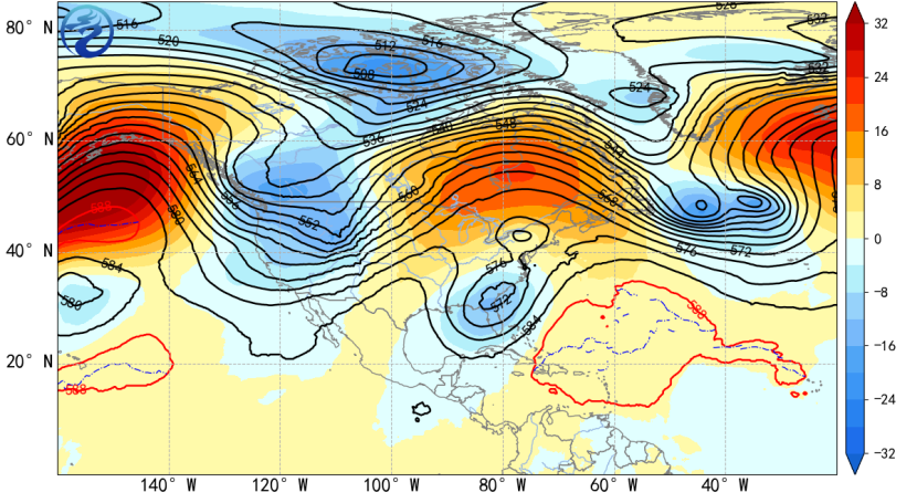 图9 2025年10月12日500hPa平均位势高度及距平(单位:dagpm)