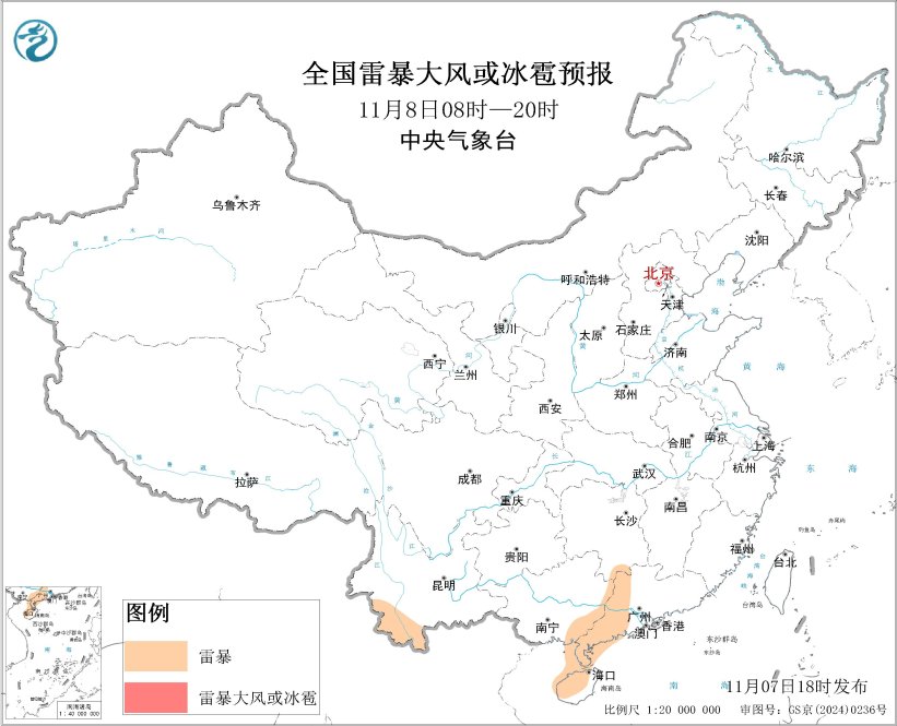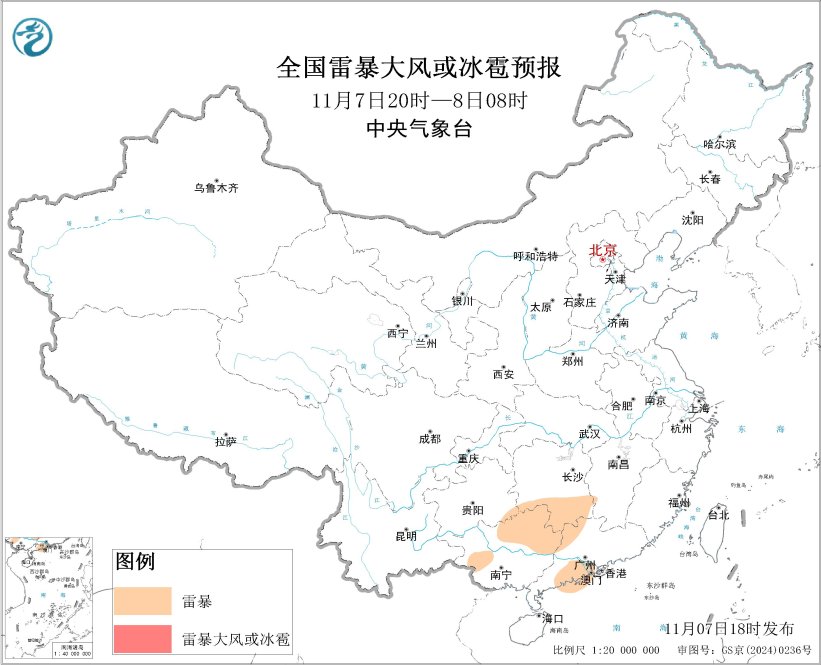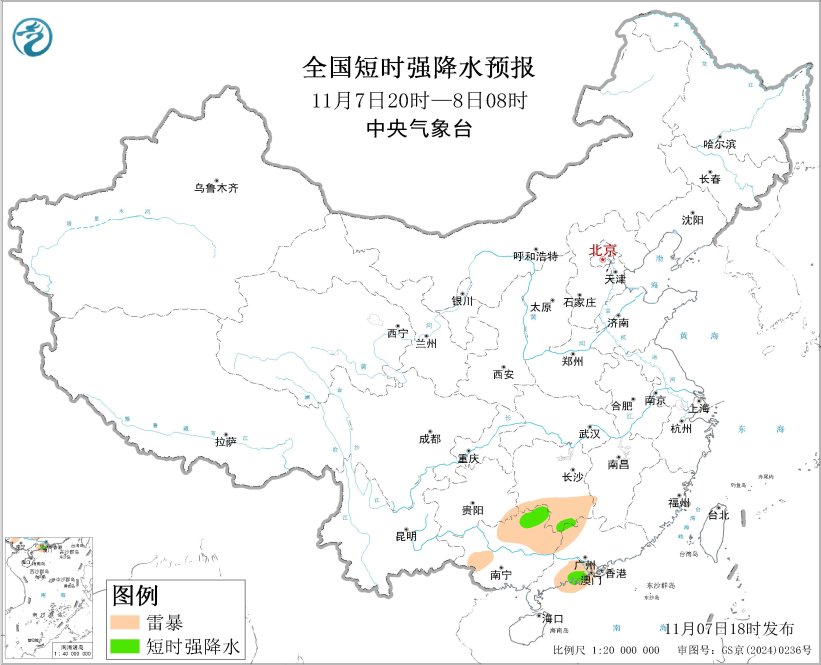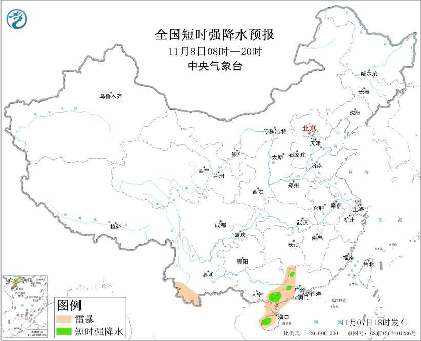 预计11月7日20时至8日20时,湖南南部、广西东北部、广东西北部和西南部、海南岛西部等地的部分地区将有短时强降水天气,小时雨量20-30毫米。