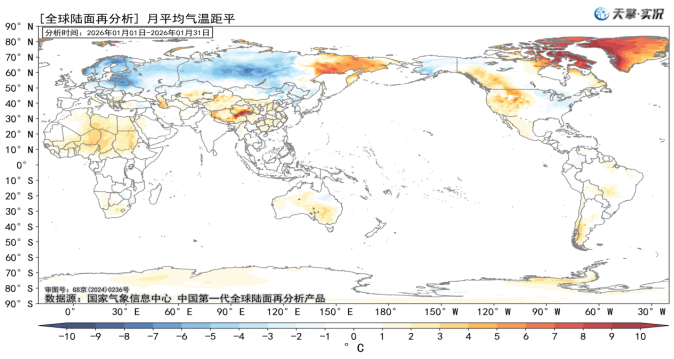 2026年1月,欧洲大部、中西伯利亚、中国东北部地区、加拿大东南部、美国东北部平均气温较常年同期偏低1~3℃,非洲北部、中亚、西亚、俄罗斯远东地区、中国西部地区、加拿大西部和东北部、美国西部气温偏高1~3℃,全球其余大部地区气温接近常年。