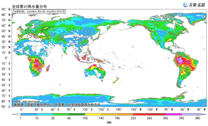 图2 2026年1月全球累计降水量 ( 单位:mm)