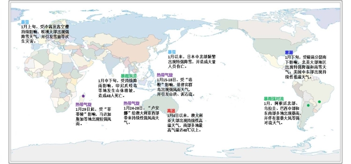 2026年1月,全球灾害性天气主要有寒潮、暴风雪、暴雨洪涝、高温热浪等(图3)。北美中东部、欧洲大部、中亚及日本中北部等地受强冷空气影响,遭遇大风降温及强雨雪天气。1月下旬,北美寒潮引发特强降雪及持续性低温,造成多人死亡。印度尼西亚、马达加斯加、莫桑比克、巴西等地出现持续性强降水,并引发山体滑坡、洪涝等次生灾害。此外,澳大利亚大部出现极端高温天气,南部多地最高气温打破1901年以来历史记录。