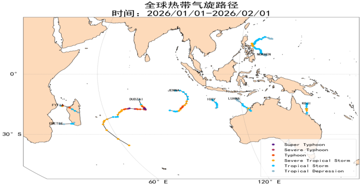 2026年1月,全球共有8个热带气旋生成,比常年同期(6.0个)偏多2.0个(表1)。西南印度洋生成3个,其中“埃韦策”、“菲蒂娅”均生成于莫桑比克海峡,之后东移登陆马达加斯加;澳大利亚附近海域生成4个,其中“科吉”、“卢安娜”分别登陆澳大利亚东北部、西北部沿海;西北太平洋生成1个(图4)。
