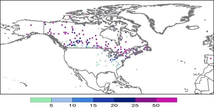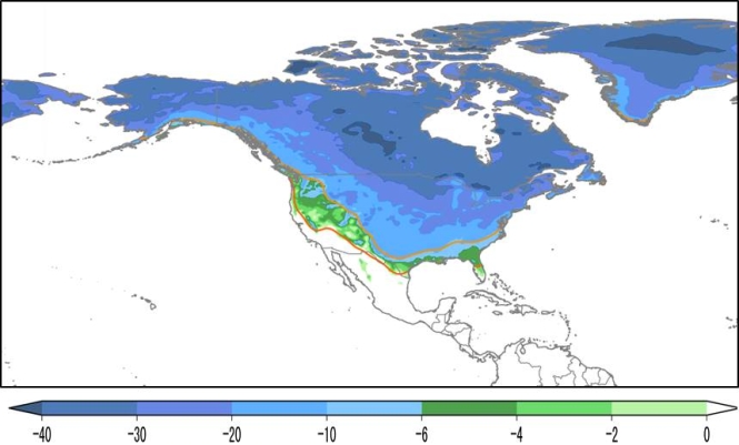 2026年1月下旬,北美遭遇了一系列严重的冬季风暴,影响范围覆盖加拿大和美国大部分地区,风暴带来大范围强降雪、雨夹雪、冻雨及极寒天气,北美东部和北部大部地区最低气温下降到-40℃以下,部分地区降至-45℃以下,体感温度接近-50℃(图5a);加拿大南部、美国东北部积雪达到40厘米以上,其中北卡罗来纳州沿海地区积雪达46厘米(图5b),创近150年纪录。暴风雪导致大规模断电、交通中断。截止1月31日,死亡人数超过100人。