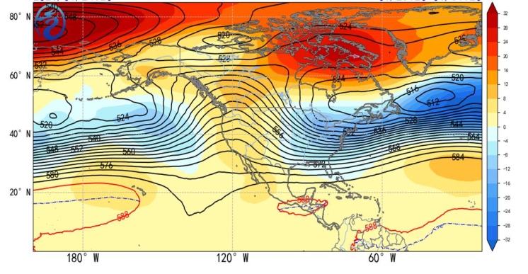 图5c为2026年1月23-31日平均500hPa位势高度及距平,可见,北美北部的极地地区为异常强的高压坝,北美西部为高压脊,东部为冷涡或低压,造成极地冷空气大举南下影响北美中东部,造成持续寒流。寒流经过五大湖区域,因大湖效应等因素引发持续性强降雪。